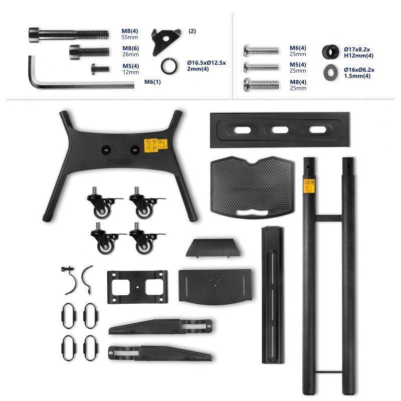 Стойка поставляется со стандартными аксессуарами, такими как полка над телевизором для камеры и полка для аксессуаров AV. Все необходимые крепежные элементы и метизы поставляются в комплекте со стойкой ONKRON TS1551.