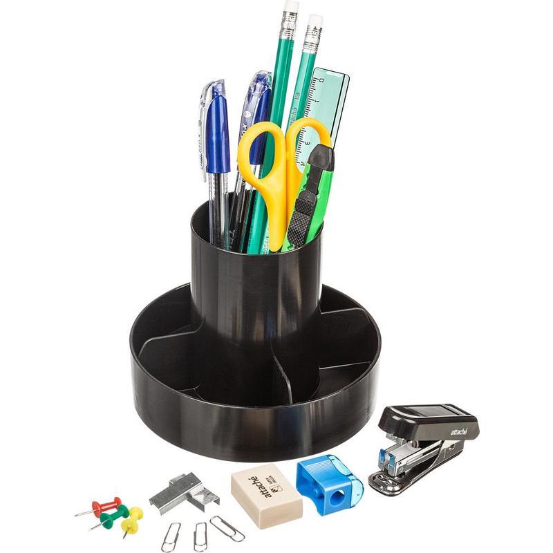 Настольный набор Attache Economy выполнен из пластика черного цвета. Включает 14 предметов: две шариковые ручки, два карандаша с ластиком, нож канцелярский, точилка, ластик, ножницы, линейка, степлер, скобы, скрепки, кнопки и подставку.Подставка-трансформер, в зависимости от расположения лотка, количество отделений составляет 5 или 6. Поставляется в термоусадочной пленке. Размеры изделия (ДxШxВ): 118x118x97 мм.