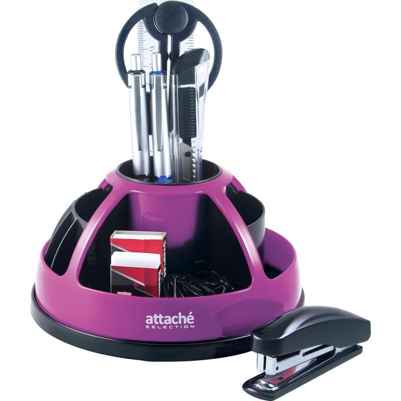 Настольный набор Attache выполнен высококачественного пластика двухцветов — черного и фуксия. Имеет вращающуюся на 360градусов основу. В комплект входят: подставка, ножницы, линейка,степлер № 10, скобы, нож, ластик, скрепки, механическийкарандаш, механическая шариковая ручка.