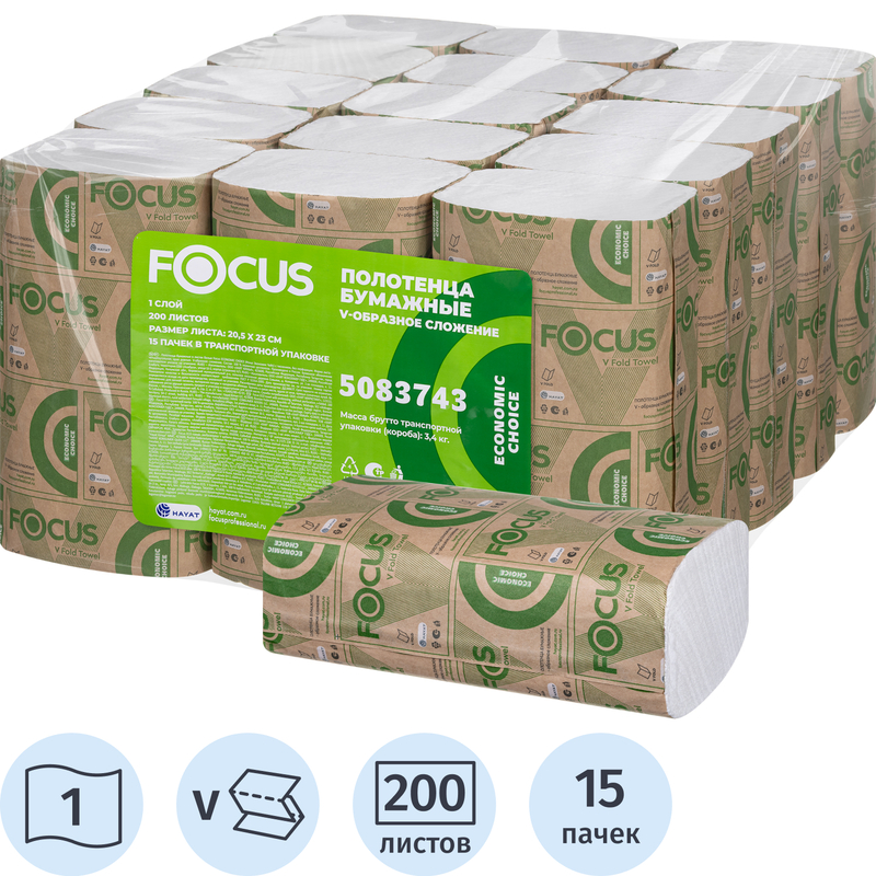 Полотенца бумажные листовые Focus H3 V-сложение (ZZ) 1-слойные белые 15 пачек по 200 листов (5083743).