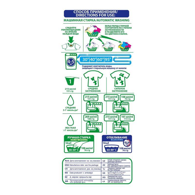 Способ применения: насыпьте необходимое количество порошка в соответствующее отделение стиральной машины перед началом стирки.