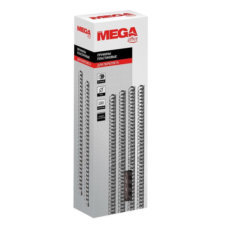 Пружины ProMEGA Office предназначены для сшивания до 45 листов формата А4 при помощи брошюровщика. Позволяют вынимать и добавлять листы в готовый документ. Изготовлены из прочного прозрачного пластика, состоят из 21 кольца диаметром 8 мм, шаг переплета — 3:1. Поставляются по 100 штук в упаковке.