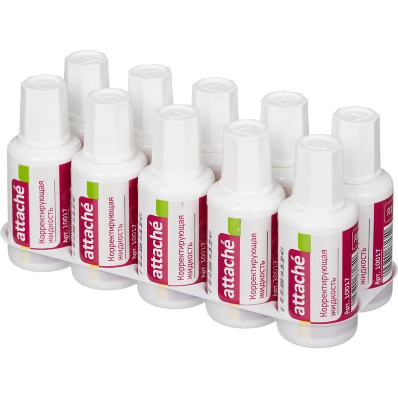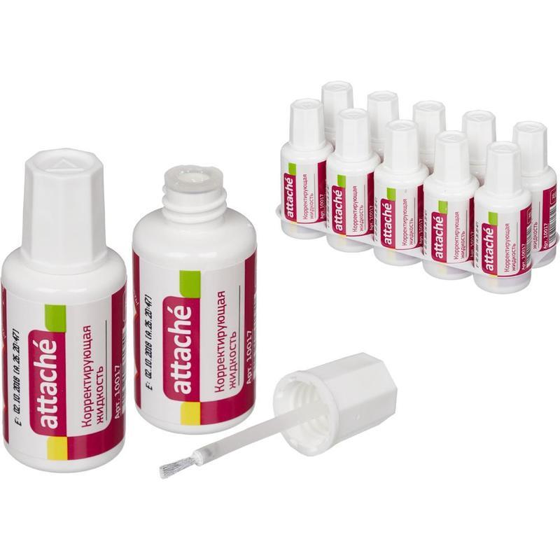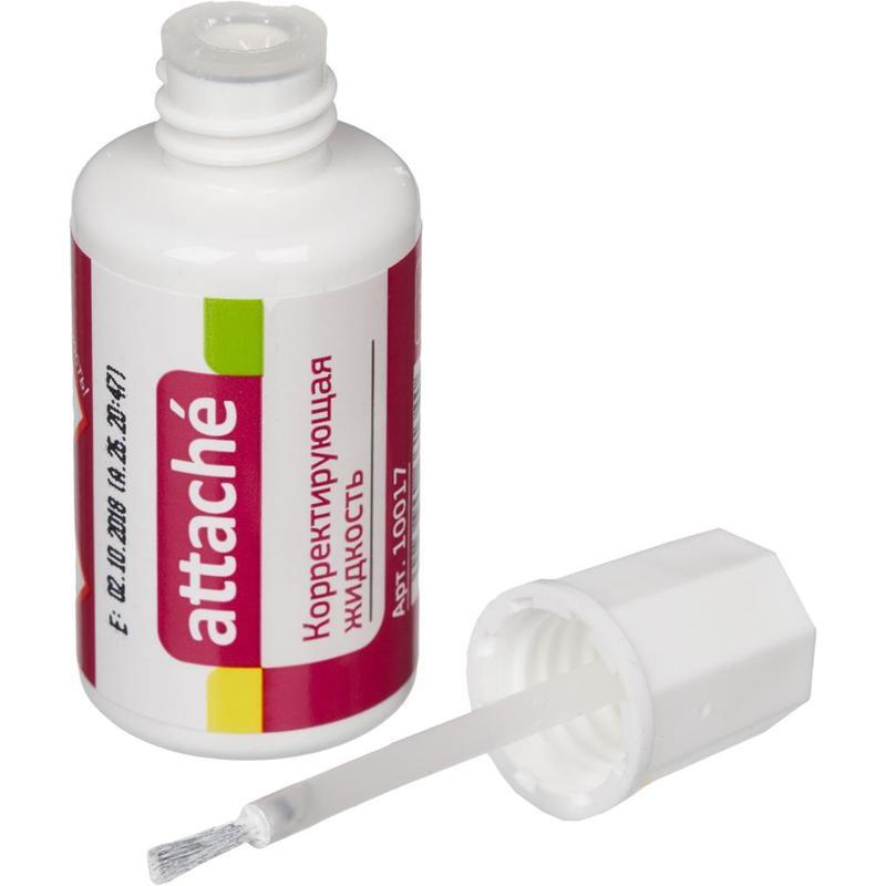 Корректирующая жидкость Attache применяется для корректировки всех типов документов, включая бумагу для факсов. Ложится ровным гладким слоем, создает непрозрачное покрытие. Имеет быстросохнущую основу. Во флаконе есть металлический шарик (перед использованием рекомендуется встряхивать). Вид кисточки — ворс. Объем флакона с корректирующей жидкостью составляет 20 мл.
