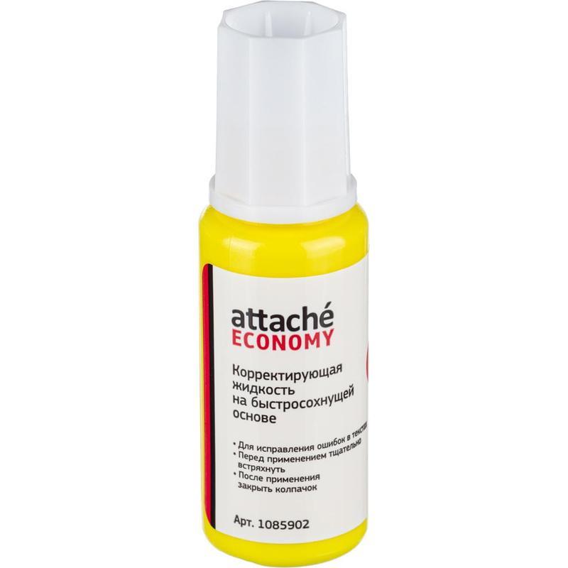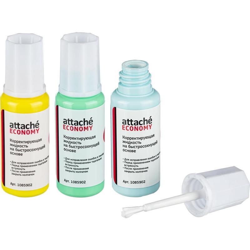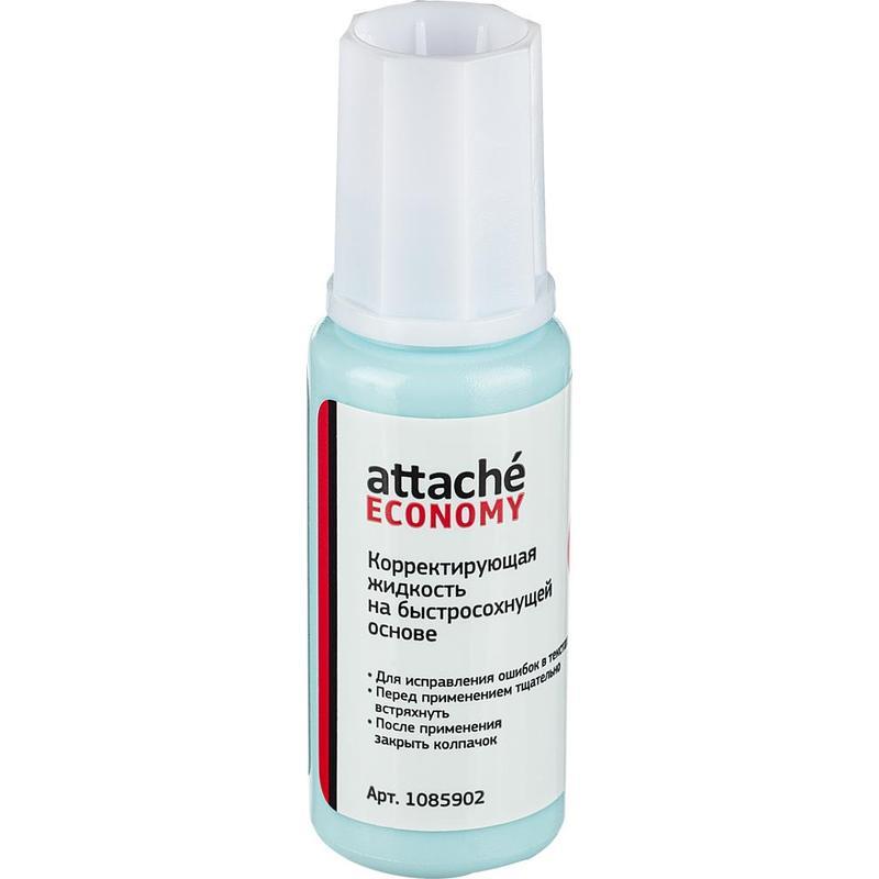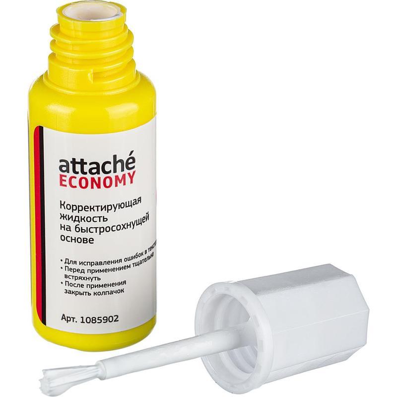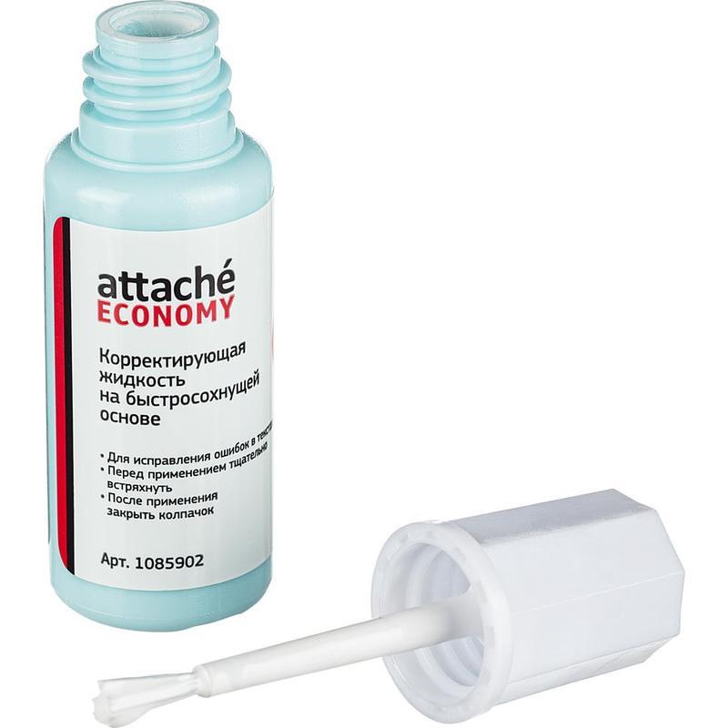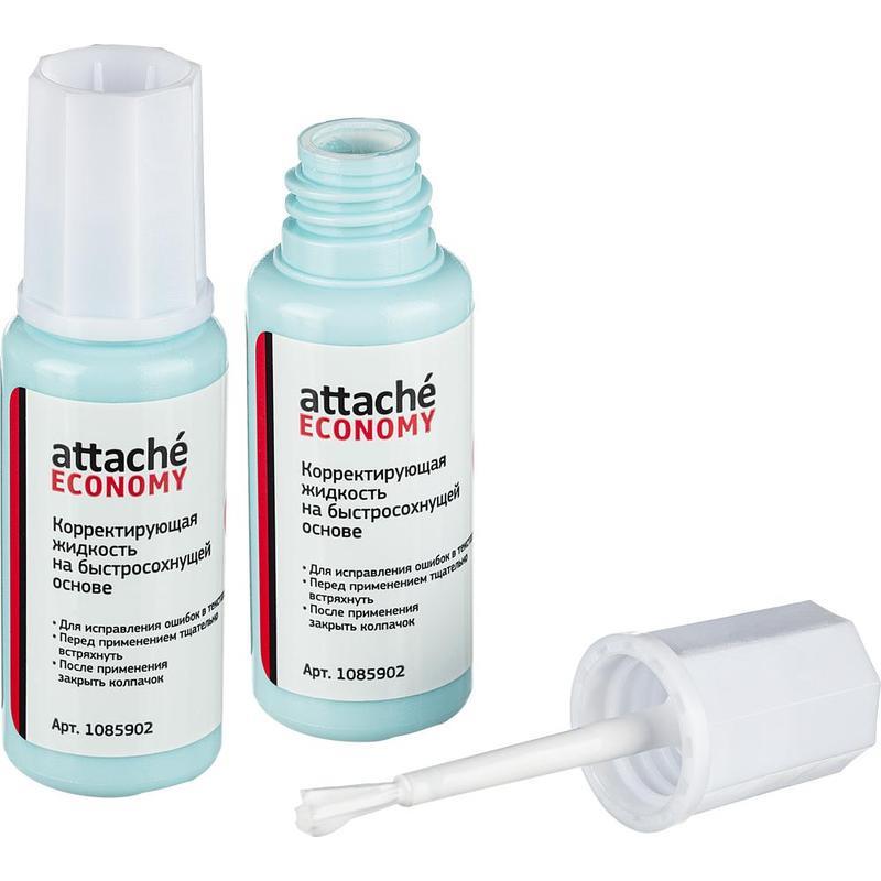 Корректирующая жидкость Attache Economy применяется для корректировки всех типов документов, включая бумагу для факсов. Ложится ровным гладким слоем, создает непрозрачное покрытие. Имеет быстросохнущую основу. Во флаконе есть металлический шарик (перед использованием рекомендуется встряхивать). Вид кисточки — ворс. Объем флакона с корректирующей жидкостью составляет 12 г.