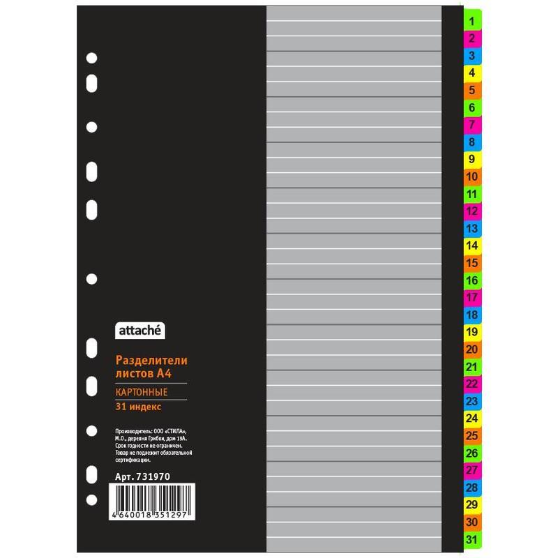 Разделители листов Attache Selection формата А4 изготовлены из прочного картона. Размер — 297x220 мм. Плотность листов — 150 г/кв.м. Универсальная перфорация совместима с различными типами папок. В комплекте 31 лист с двусторонними ярлыками цвета «НЕОН» и нанесением индексации, а также титульный лист для удобства и быстроты поиска.
