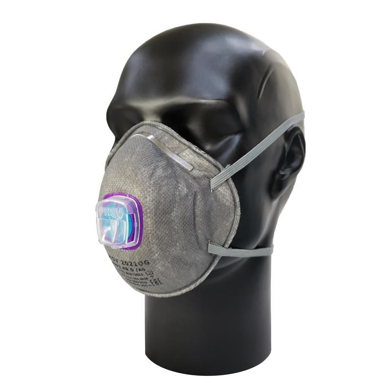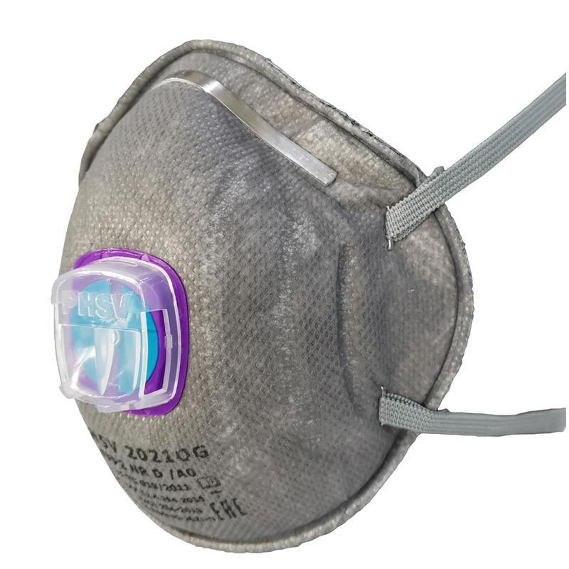 Фильтрующая полумаска PHSV FFP2 NR D/A0 2021OG, с клапаном выдоха, класс фильтрующей эффективности FFP2 до 12 ПДК, чашеобразной формы. Защищает органы дыхания при работах в помещениях с повышенной температурой воздуха, повышенной влажностью и высокой запыленностью до 12 ПДК, а также в среде с содержанием паров органических веществ низкой концентрации.