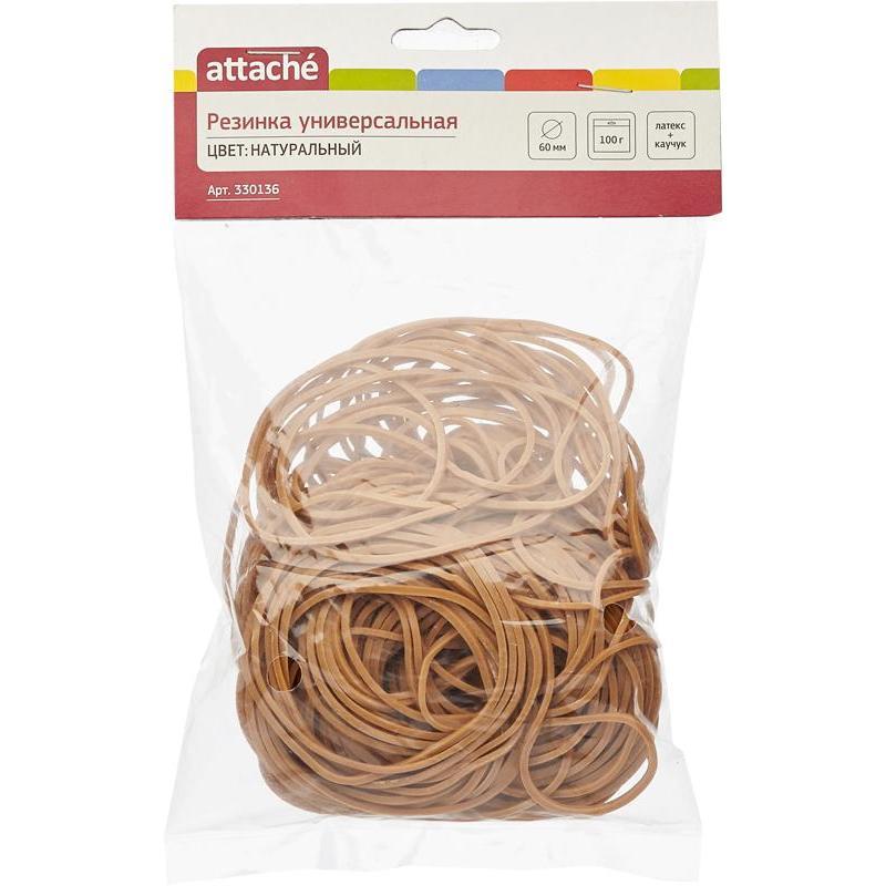Универсальная резинка Attache натурального цвета, изготовленная с применением каучука и латекса, обладающих высокой эластичностью. Может использоваться для фасовки зелени, овощей и цветов, перевязки денежных купюр, упаковки консервов и пачек с лекарствами. Латекс повышает прочность изделия и позволяет ему многократно растягиваться без повреждений. Диаметр резинки — 6 см. Поставляется в упаковках по 100 г. В упаковке 180 плюс-минус 5% штук.