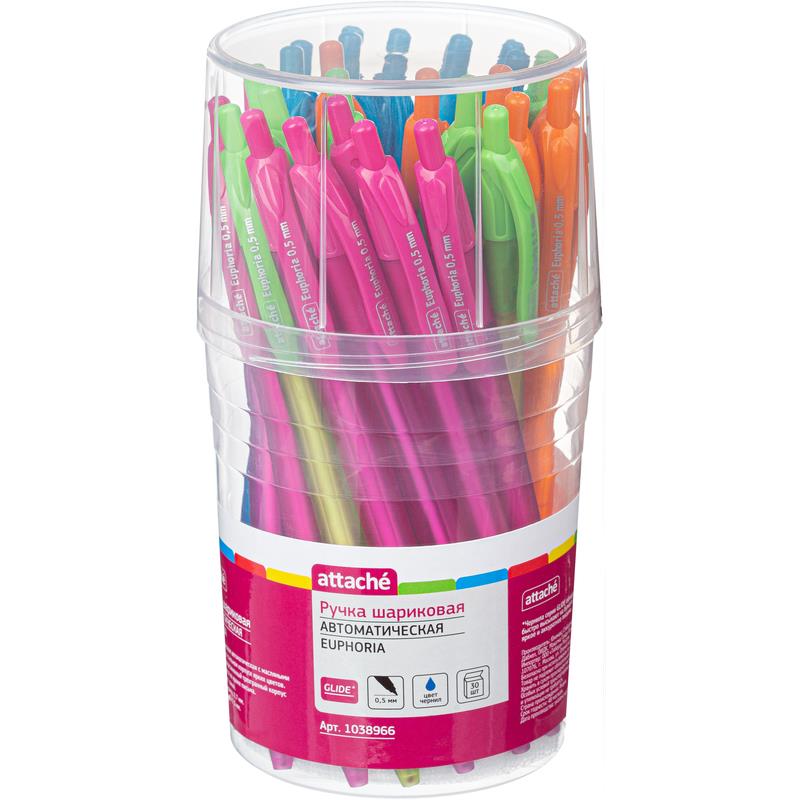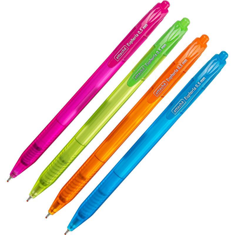 Автоматическая шариковая ручка Attache Euphoria выполнена в прорезиненном корпусе ярких цветов. Удобная трехгранная форма корпуса. Игольчатый пишущий узел. Толщина линии письма — 0.5 мм. Диаметр шарика — 0.7 мм. Ручка, созданная по революционным технологиям с использованием материалов высшего качества, обеспечивает мягкое и качественное письмо за счет использования синих чернил низкой вязкости на масляной основе. Сочетание уникальных технологий производства чернил и пишущего узла позволяет писать на 20% дольше без пропусков и помарок при минимальном давлении на ручку. Ручка также предназначена для левшей. Внимание! Товар поставляется в нескольких вариантах цвета/дизайна (без возможности выбора).
