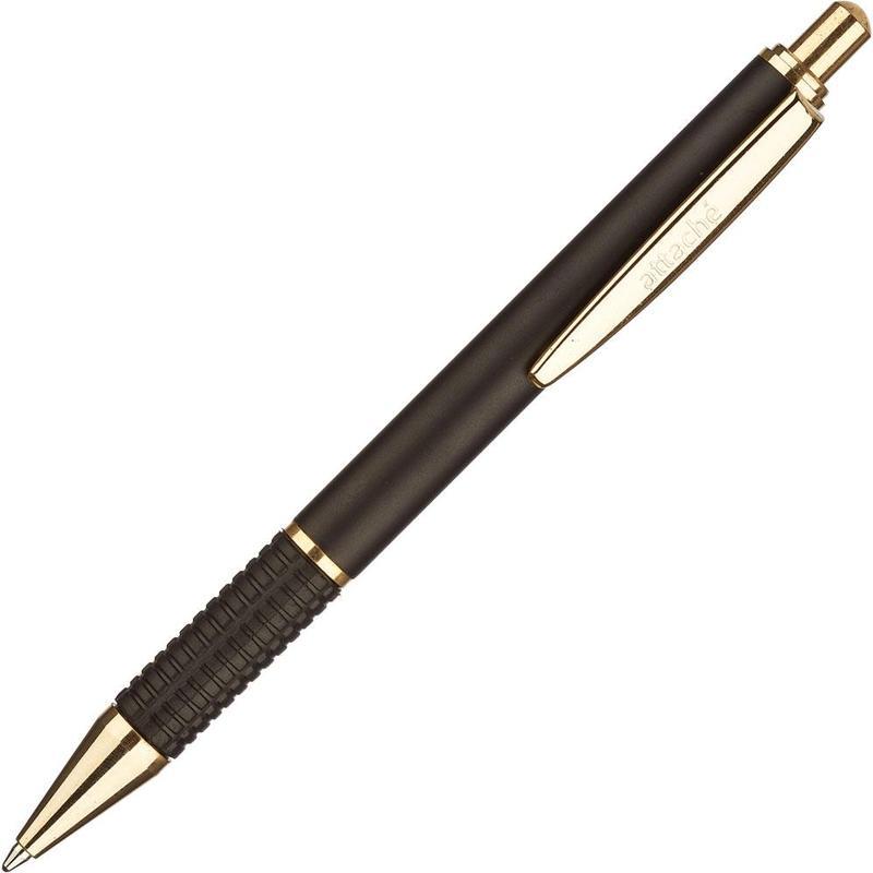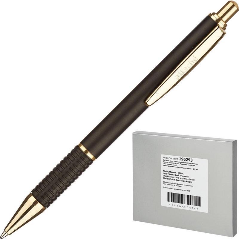 Автоматическая шариковая ручка Attache G08BL имеет латунный корпус черного цвета, элементы отделки «под золото» и удобную рельефную манжетку. Механизм подачи стержня — кнопочный. Комплектуется стержнем с пастой синего цвета.