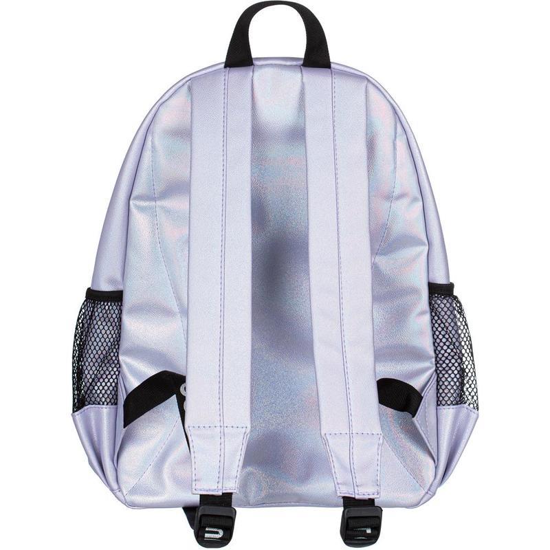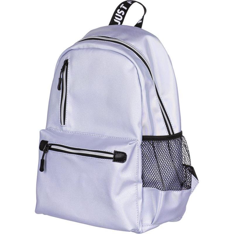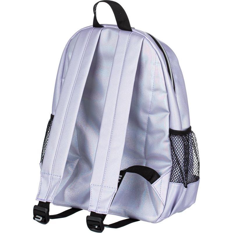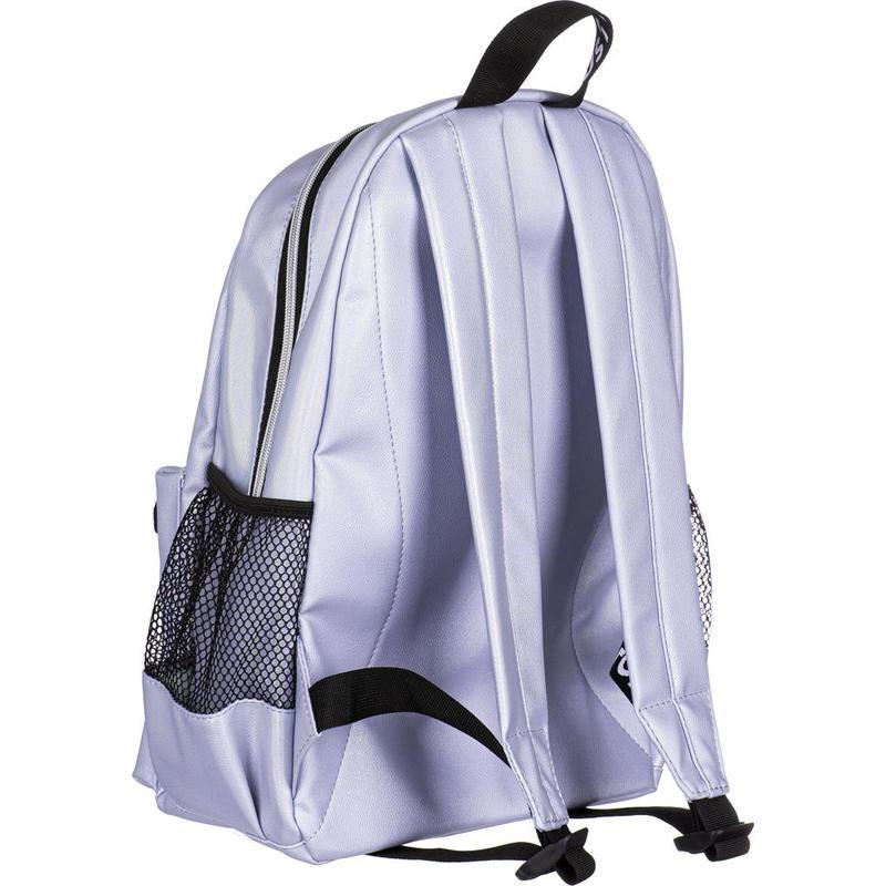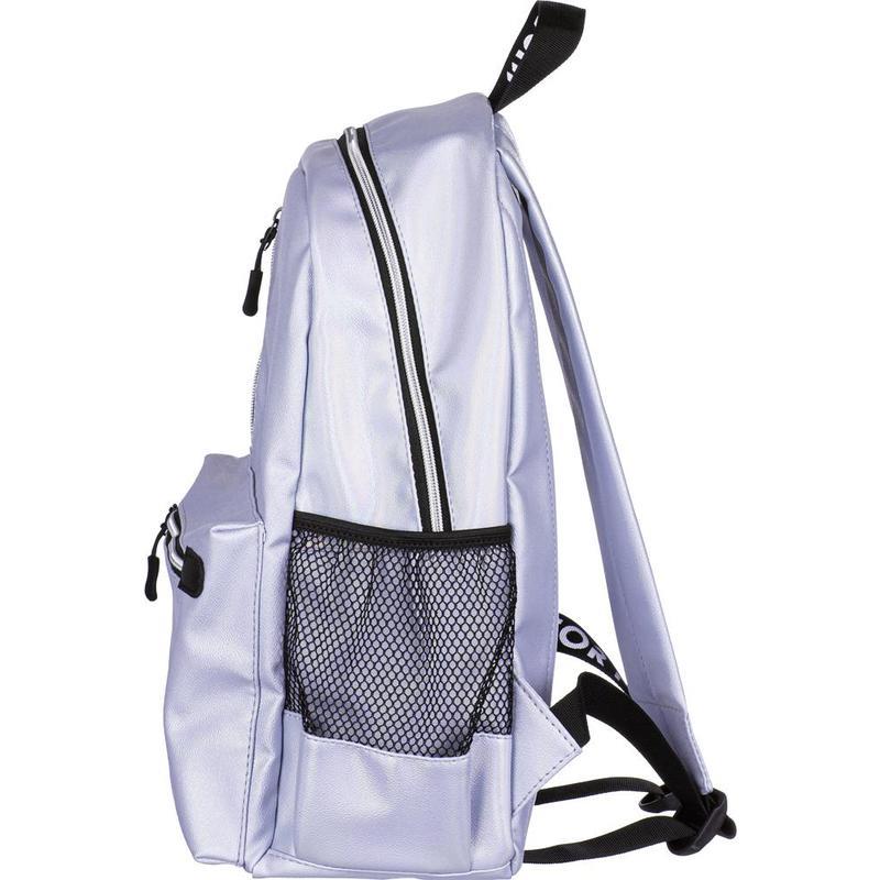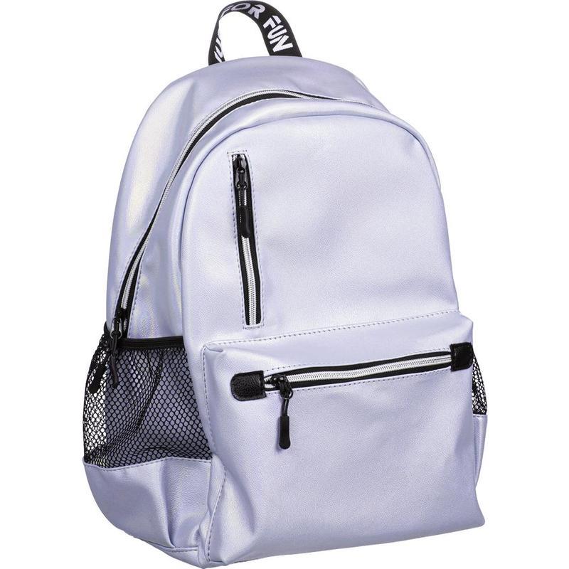 Одно основное отделение на молнии. На лицевой стороне имеется накладной карман на молнии и дополнительный вертикальный карман на молнии. Два боковых кармана с сеткой. Внутри рюкзак отделан подкладочной тканью и имеет открытый внутренний карман. Мягкая уплотненная спинка, уплотненные задние лямки. Сверху ручка-петелька для ношения в руке. Особенности: материал рюкзака — перламутровая экокожа.