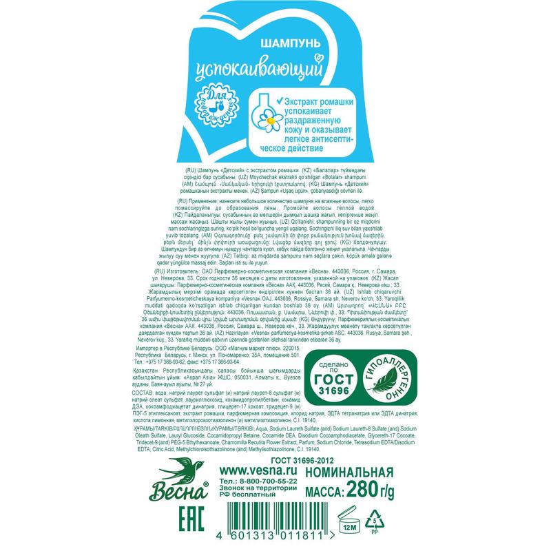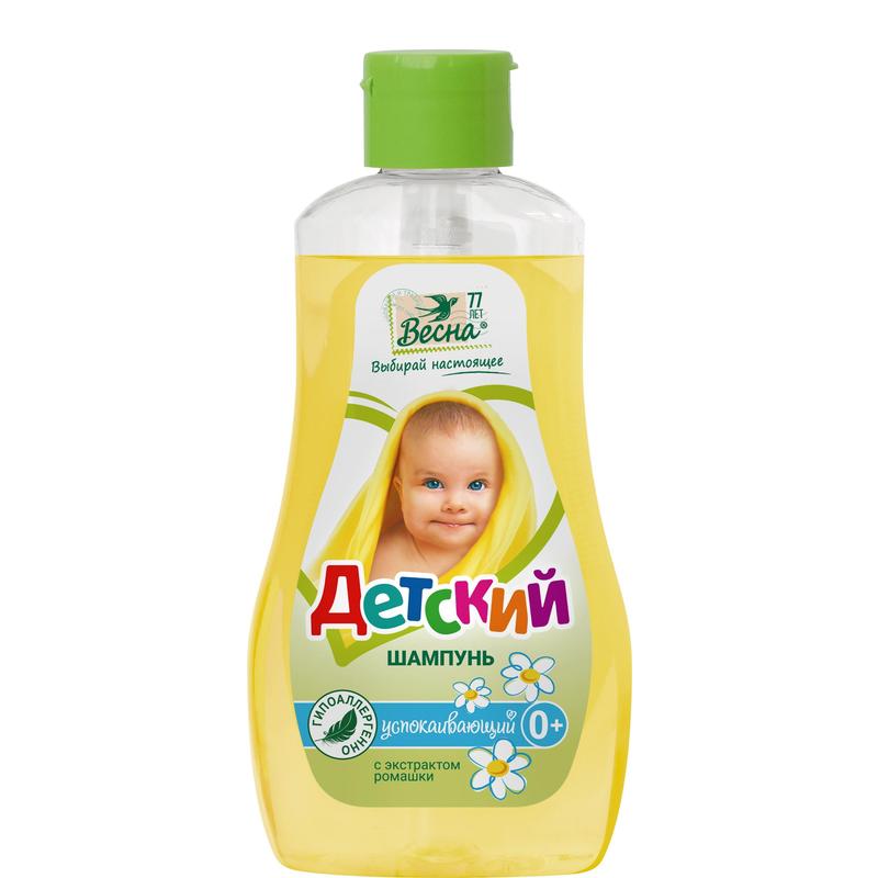 Детский шампунь Весна 280 г создан для ухода для очищения волос и кожи головы наворожденных и маленьких детей. Детский шампунь деликатно очищает волосы любой дины и облегчает расчесывание, быстро и легко смывается не вызывая раздражений. Содержит натуральный экстракт ромашки, смягчает и успокаивает кожу головы, заботясь о малыше с первых дней жизни. Содержит натуральный экстракт ромашки.