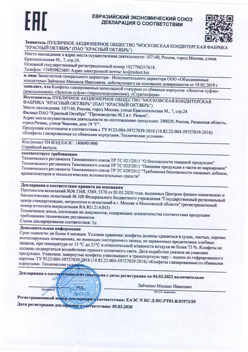 Состав: шоколадная глазурь (сахар, какао тертое, эквивалент масло какао(растительные негидрогенизированны?е масла (пальмовое, ши, иллипе,подсолнечное)),какао-порошок, эмульгаторы: лецитин соевый, Е476, ароматизаторидентичныйнатуральному Ваниль), сахар, вода питьевая, патока, пюречерносмородиновое (черная смородина, консервант- диоксид серы),желирующий агент-агар, белок сухой яичный, коньяк, регуляторкислотности- лимонная кислота, краситель Е163, ароматизатор натуральныйЧерная смородина.Противопоказано при индивидуальной непереносимости яичного белка.Пищевая ценность в 100г продукта: белки-2,5г, жиры-13г, углеводы-67г.Энергетическая ценность: 400ккал.Хранить при комнатной температуре.Срок годности от даты изготовления 4 месяца.ТУ 9123-004-59727039 Внимание! Продукты питания надлежащего качества обмену и возврату не подлежат согласно Закону РФ от 07.02.1992 N 2300-1 (ред. от 03.07.2016) «О защите прав потребителей».