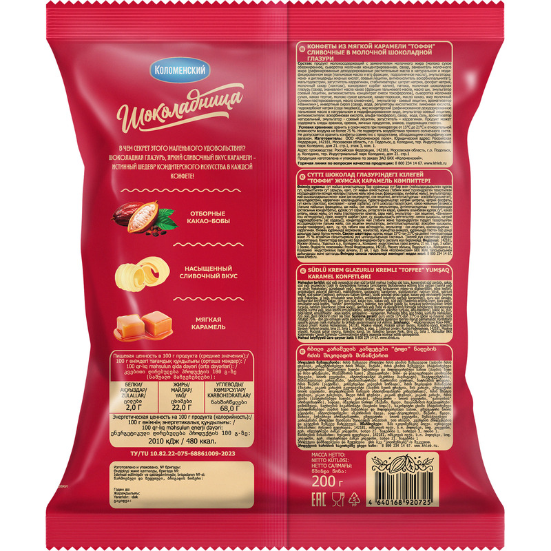 Конфеты Тоффи Шоколадница сливочные в шоколадной глазури 200 г. Шоколадная глазурь, яркий сливочный вкус карамели — истинный шедевр кондитерского искусства. Каждая конфета Тоффи «Шоколадница» покрыта нежнейшей молочной шоколадной глазурью. Конфеты точно украсят ваше чаепитие своим изысканным сочетанием вкусовых оттенков.