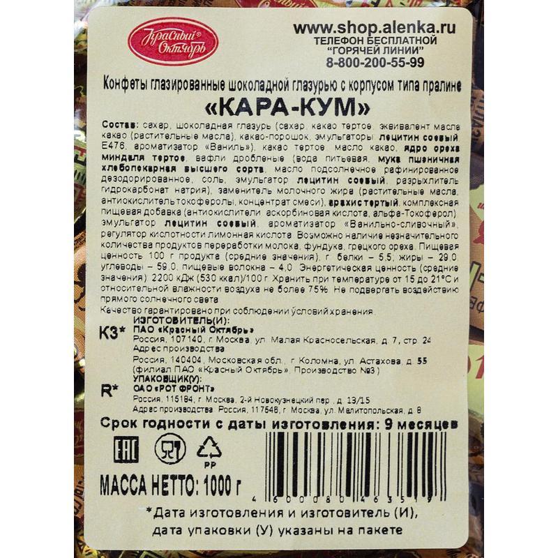Конфеты «Кара-Кум» прекрасно гармонируют с черным и зеленым чаем, кофе и обычной питьевой водой. Красивый фантик делает их заметными и привлекательными, вызывая желание обязательно продегустировать и насладиться любимым вкусом.