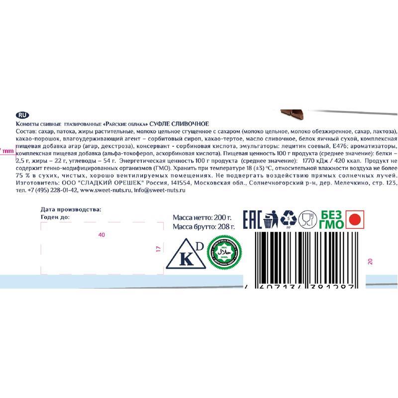 Состав: сахар, патока, жиры растительные, молоко цельное сгущенное с сахаром (молоко цельное, молоко обезжиренное, сахар, лактоза), какао-порошок, влагоудерживающий агент — сорбитовый сироп, какао-тертое, масло сливочное, белок яичный сухой, комплексная пищевая добавка агар (агент желирующий агар, декстроза), консервант — сорбиновая кислота, эмульгаторы: лецитин соевый, Е476; ароматизаторы, комплексная пищевая добавка (антиокислители альфа-токоферол, аскорбиновая кислота).