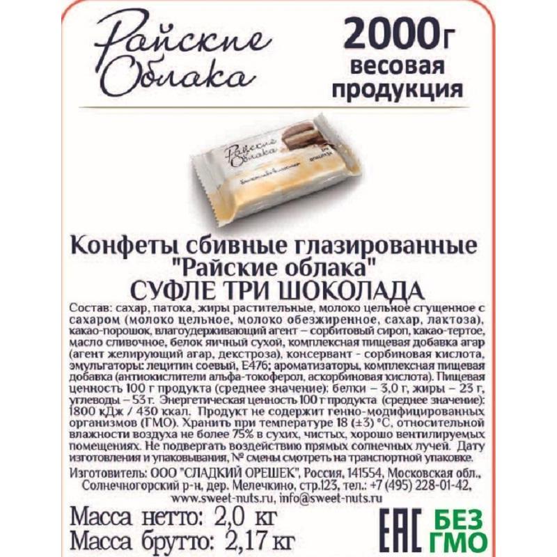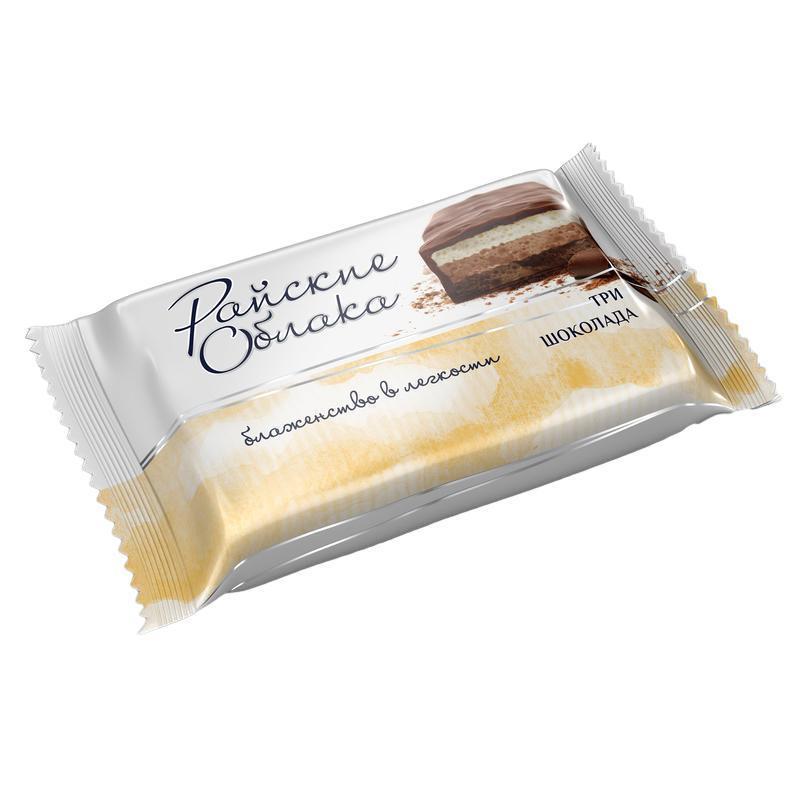 Трехслойное, нежное суфле с насыщенным вкусом трех шоколадов: молочный, сливочный, темный.