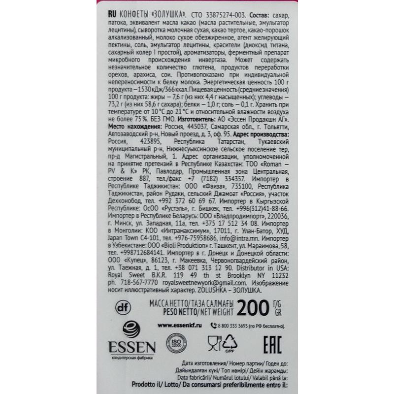 Конфеты Золушка представляют собой нежную молочную начинку в корпусе из желейной массы со сливочным вкусом, покрыты ароматной глазурью. Конфеты Золушка сделают ваше чаепитие сказочно приятным и вкусным!Состав: сахар, патока, масла растительные, какао-порошок алкализованный, молоко сухое обезжиренное, агент желирующий пектины, эмульгатор лецитин соевый, ферментный препарат микробного происхождения инвертаза, красители (диоксид титана, сахарный колер I простой), ароматизаторы. Может содержать незначительное количество глютена, яичного белка, продуктов переработки орехов, арахиса. Без ГМО. Противопоказано при индивидуальной непереносимости к белку молока.Вес: 200 г.Пищевая ценность (средние значения) 100 г продукта: жиры — 8,0 г (из них 5,5 г насыщенных); углеводы — 72,0 г (из них 45,6 г сахара); белки — 1,5 г. Энергетическая ценность 100 г продукта: 1550 кДж, 370 ккал.Срок годности: 12 месяцев. Условия хранения: при температуре от 10°С до 21°С и относительной влажности воздуха не более 75%.Производитель: АО «Эссен Продакшн АГ»Страна производства: Россия.