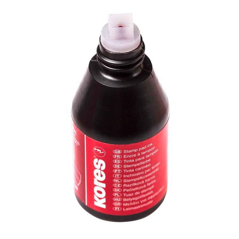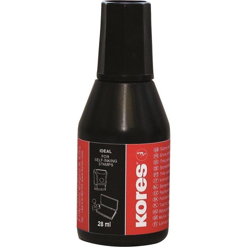 Штемпельная краска Kores на водно-масляной основев пластиковом флаконе объемом 28 мл. Цвет черный. Дозаторобеспечивает равномерное нанесение на штемпельную подушку. Подходитдля использования со всеми видами резиновых штампов.