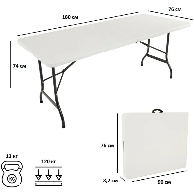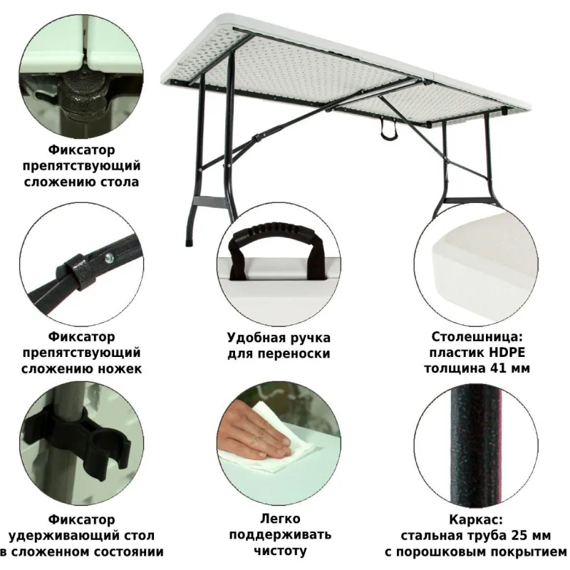 Стол складной подойдет как для дачи и сада, так и для помещения. За ним можно собраться большой и дружной компанией (до 8 человек), чтобы приятно провести время на свежем воздухе. Изделие выполнено из качественного пластика с каркасом из стали и складывается в одно движение. В собранном состоянии не занимает много места, поэтому его удобно как хранить, так и транспортировать. Среди преимуществ складного пластикового стола можно также отметить возможность фиксации ножек.