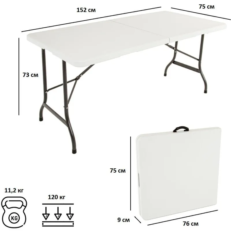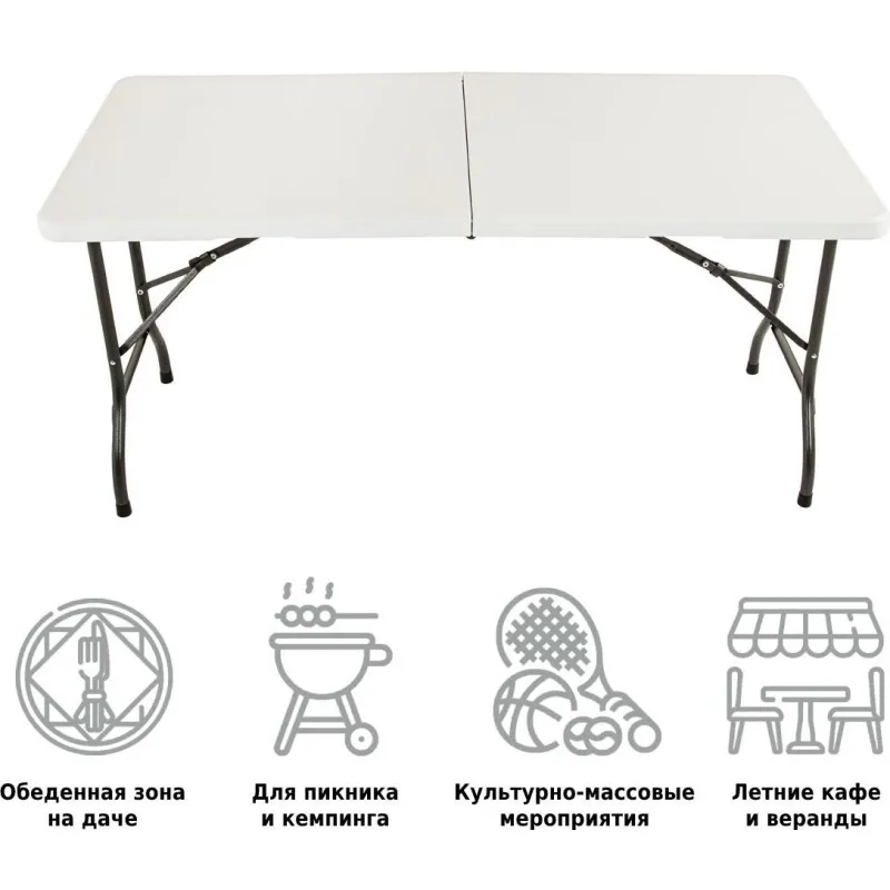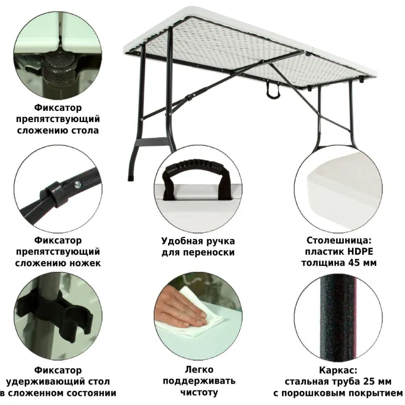 Стол складной подойдет как для дачи и сада, так и для помещения. За ним можно собраться в кругу семьи (до 6 человек), чтобы пообедать или поужинать на свежем воздухе. Изделие выполнено из качественного пластика с каркасом из стали и складывается в одно движение. В собранном состоянии не занимает много места, поэтому его удобно как хранить, так и транспортировать. Среди преимуществ складного пластикового стола можно также отметить возможность фиксации ножек.