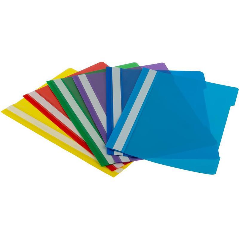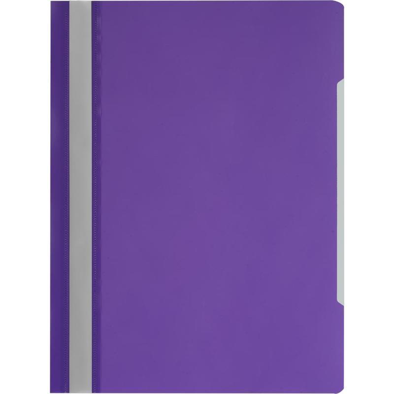 Папка-скоросшиватель А4 формата, с прозрачным верхним листом. Предназначена для хранения перфорированных документов А4. Изготовлена из полипропилена. Плотность верхнего листа 100 мкм, плотность нижнего листа папки 120 мкм. Пластиковый корешок с белой полосой для размещения информации. 10 штук в упаковке.