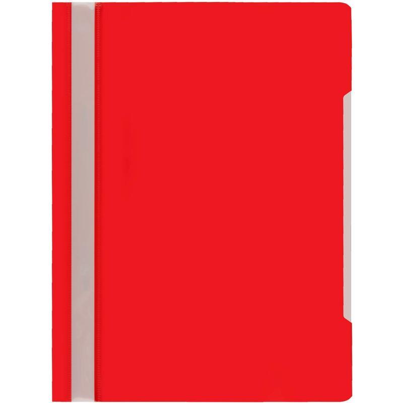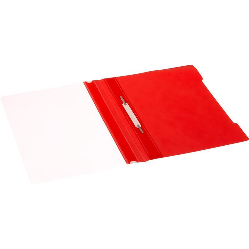 Папка-скоросшиватель А4 формата, с прозрачным верхним листом. Предназначена для хранения перфорированных документов А4. Изготовлена из полипропилена. Плотность верхнего листа 100 мкм, плотность нижнего листа папки 120 мкм. Пластиковый корешок с белой полосой для размещения информации. 10 штук в упаковке.