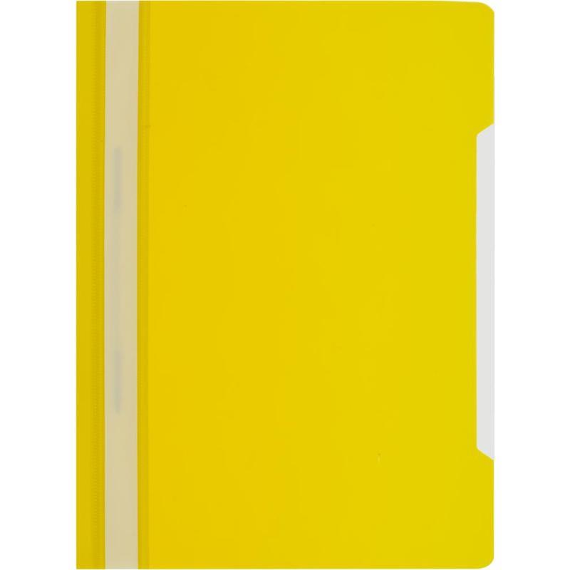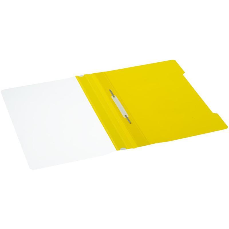 Папка-скоросшиватель А4 формата, с прозрачным верхним листом. Предназначена для хранения перфорированных документов А4. Изготовлена из полипропилена. Плотность верхнего листа 100 мкм, плотность нижнего листа папки 120 мкм. Пластиковый корешок с белой полосой для размещения информации. 10 штук в упаковке.