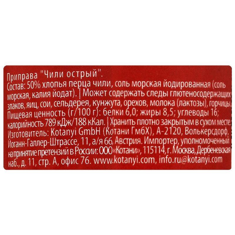 Приправа Kotanyi «„Чили острый“» отлично подойдет для приготовления блюд из мяса, рыбы, птицы, овощей, супов, морепродуктов, легких соусов, яиц.Мельница имеет две степени помола. Состав:50% хлопья перца чили, соль морская йодированная.Может содержать следы глютеносодержащих злаков, яиц, сои, сельдерея, кунжута, орехов, молока (лактозы), горчицы.Пищевая ценность на 100г продукта: белки 6г, жиры 8,5г, углеводы 8,5г.Энергетическая ценность: 188 ккал.Хранить в сухом темном месте.Срок годности 36 месяцев.Внимание! Продукты питания надлежащего качества обмену и возврату не подлежат согласно Закону РФ от 07.02.1992 N 2300–1 (ред. от 03.07.2016) «О защите прав потребителей».