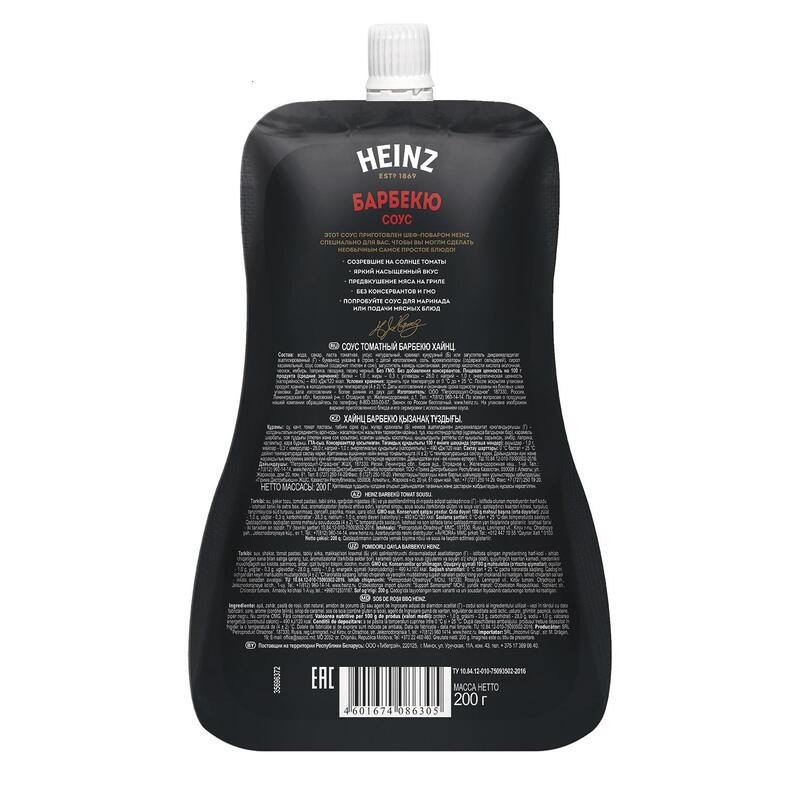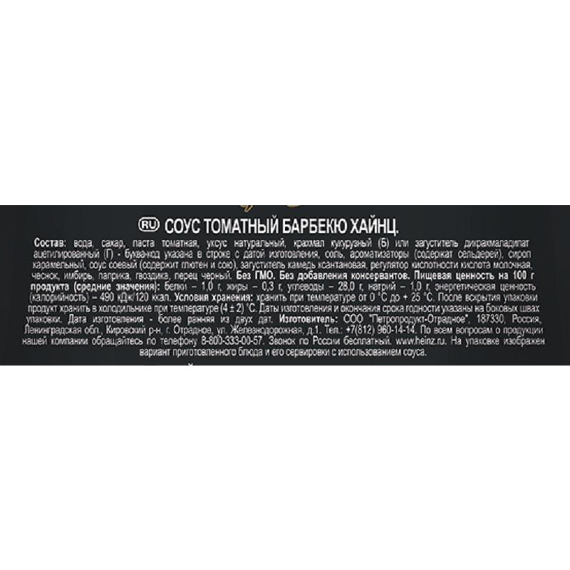 Соус Heinz барбекю 200 г — это гармоничное сочетание спелых томатов с классическим японским маринадом Терияки, чесноком и пряными специями, которые подчеркивают вкус блюд, приготовленных на гриле. Он придает характерный аромат жареному мясу и свиным ребрышкам, котлетам и тефтелям, сосискам и куриным крылышкам, пицце и пельменям, печеному картофелю или картофельным долькам во фритюре. Состав: вода, сахар, паста томатная, уксус натуральный, соль, загустители (крахмал кукурузный, камедь ксантановая), соу-маринад Терияки (соевый соус (вода, соя, пшеница, соль), вино, сахар, вода, уксус натуральный, соль, экстракты специй, луковый порошок, чесночный порошок), красители (свекольный, карамельный), порошок чесночный, ароматизатор натуральный (содержит сельдерей), регулятор кислотности, кислота молочная, ароматизатор, имбирь, гвоздика, паприка красная, перец черный. Пищевая ценность: белков 1.1 г, жиры 0 г, углеводов 28.6 г.Энергетическая ценность на 100 г: 120 кКал/502 кДжВес: 200 г Тип упаковки:дой-пак с дозаторомУсловия хранения: хранить при температуре не выше от 0 °С до 25 °С и относительной влажности воздуха не более 75%.Срок годности: 12 месяцевСтрана производства: Россия.