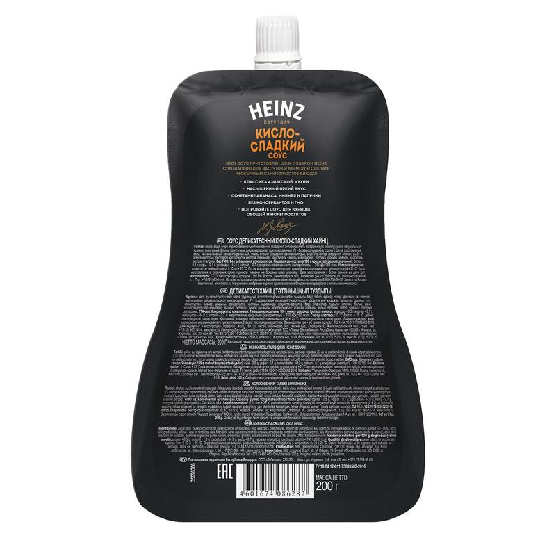 Соус Heinz Кисло-сладкий 200 г — это смесь специй с пряным имбирем, ароматное абрикосовое пюре и ананасовый сок, красная паприка и пикантный вустерский соус. Хорошо сочетается с рисом, морепродуктами, свининой. С кисло-сладким соусом Heinz даже обыкновенная курица станет необыкновенно вкусной, впрочем, как и множество других знакомых блюд.Состав: сахар, вода, пюре абрикосовое концентрированное (содержит антиокислитель аскорбиновую кислоту), уксус натуральный, крахмал кукурузный, соль, сок ананасовый концентрированный, смесь специй (содержит ароматизаторы), соус ворчестер (содержит ароматизаторы), регулятор кислотности кислота лимонная, загуститель камедь ксантановая, паприка красная, имбирь, краситель экстракт паприки.Пищевая ценность: белков 0.8 г, жиры 0.2 г, углеводов 19.9 г. Энергетическая ценность на 100 г: 180 ккалВес: 200 грамм.Тип упаковки: дой-пак с дозаторомУсловия хранения: хранить при температуре не выше от 0 °С до 25 °С и относительной влажности воздуха не более 75%.Срок годности: 12 месяцевСтрана производства: Россия