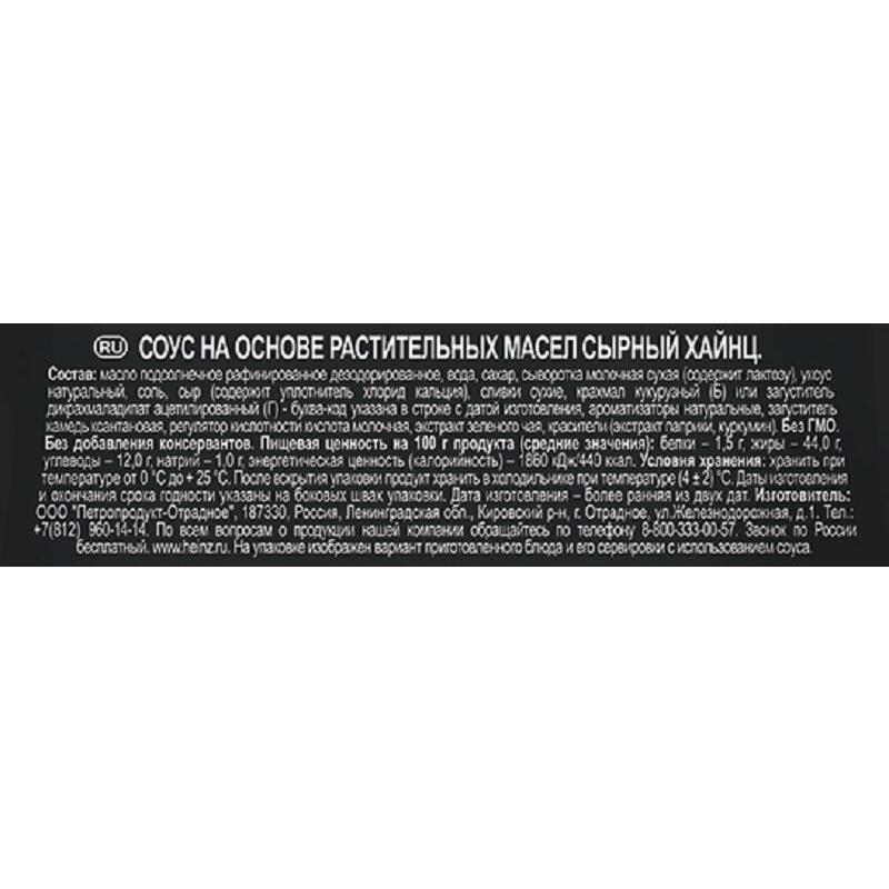 Соус HEINZ Сырный, на основе растительных масел — универсальный продукт, который можно подавать к блюдам из птицы, мяса и овощей. Сырный соус предлагают к чипсам, картофелю фри, жареным куриным крылышкам, наггетсам и другим блюдам.Состав: масло подсолнечное рафинированное дезодорированное, вода, сахар, сыворотка молочная сухая (содержит лактозу), уксус натуральный, соль, сыр (содержит уплотнитель — хлорид кальция), сливки сухие, крахмал кукурузный или загуститель — дикрахмаладипатацетилированный, ароматизаторы натуральные, загуститель — камедь ксантановая, регулятор кислотности — кислота молочная, экстрактзеленого чая, красители (экстракт паприки, куркумин).Пищевая ценность: белков 1 г, жиры 44 г, углеводов 12 г. Энергетическая ценность: 440 кКал/1843 кДжВес: 200 грамм.Тип упаковки: дой-пак с дозаторомУсловия хранения: хранить при температуре не выше от 0 °С до 25 °С и относительной влажности воздуха не более 75%.Срок годности: 12 месяцевСтрана производства: Россия