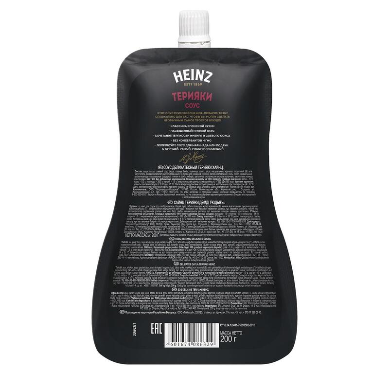 Соус Heinz Терияки — отличается имбирным вкусом с пряными нотками. В составе только отборные ингредиенты, без ГМО и красителей, вредных добавок и консервантов. В основе соевый соус и имбирь. Такое сочетание дополнит блюда из для риса и морепродуктов, птицы и мяса. При обжарке ингредиентов придает им в меру солоноватый привкус со сладковатыми нотками. Может использоваться в качестве салатной заправки, подаваться к суши и роллам. Дойпак с винтовым колпачком сохраняет свойства и свежесть продукта на всем сроке годности, позволяет употребить его до последней капли.Состав: вода, сахар, соевый соус (вода, соевые бобы, пшеница, соль), уксус натуральный, крахмал кукурузный или загуститель — дикрахмаладипатацетилированный, соль, сироп карамельный, ароматизаторы натуральные (содержат глютен и сою), имбирь, регулятор кислотности — кислотамолочная, загуститель — камедь ксантановая.Пищевая ценность: белков 1.5 г, жиры 0 г, углеводов 42 г. Энергетическая ценность: 160 кКалВес: 200 грамм.Тип упаковки: дой-пак с дозаторомУсловия хранения: хранить при температуре не выше от 0 °С до 25 °С и относительной влажности воздуха не более 75%.Срок годности: 12 месяцевСтрана производства: Россия