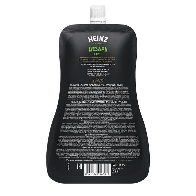Соус HEINZ Цезарь — изысканный классический вкус и легкая текстура. С соусом Heinz Цезарь вы сможете приготовить шедевр итальянской кухни без лишних усилий.Состав: вода, масло подсолнечное рафинированное дезодорированное, сахар, сыворотка молочная сухая, уксус натуральный, соль, крахмал кукурузный или загуститель дикрахмаладипат ацетилированный, сливки сухие, сыр (содержит лактозу, уплотнитель хлорид кальция), ароматизаторы, загуститель камедь ксантановая, регулятор кислотности кислота молочная, чеснок, тмин, экстракт зеленого чая, базилик, орегано, краситель каротины.Пищевая ценность: белков 1 г, жиры 38 г, углеводов 13 г. Энергетическая ценность: 560 ккалВес: 200 грамм.Тип упаковки: дой-пак с дозаторомУсловия хранения: хранить при температуре не выше от 0 °С до 25 °С и относительной влажности воздуха не более 75%.Срок годности: 12 месяцевСтрана производства: Россия