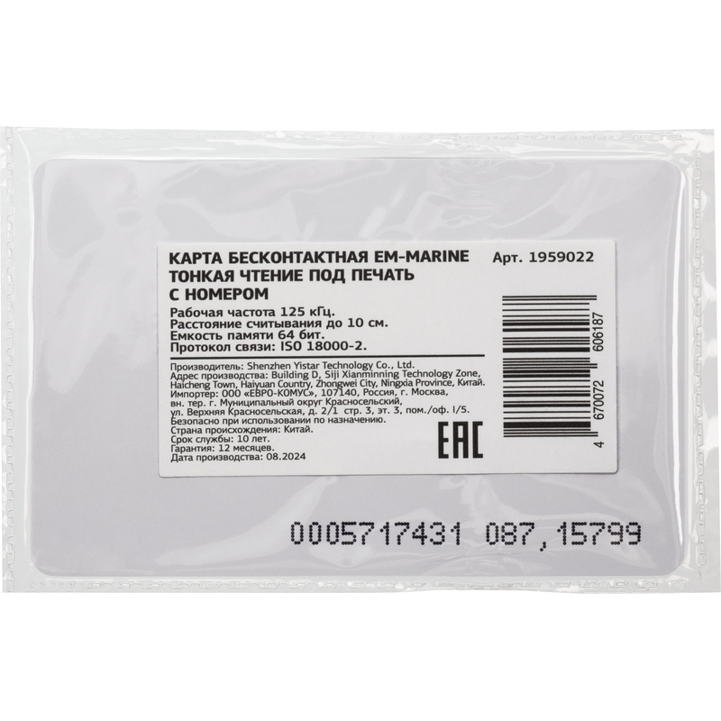 Карта EM-marine 0.84 мм от EM-marine — это практичное решение для офиса и дома, сочетающее надежность и удобство в использовании. Изготовлен с учетом современных требований к качеству и функциональности. Продукция соответствует стандартам, что гарантирует долгий срок службы и сохранение характеристик.