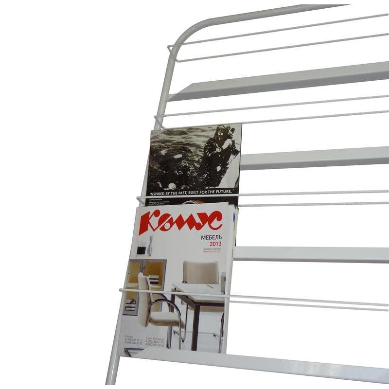 Металлическая разборная складная стойка на 10 полок для печатной продукции. В профиль наклон 11 градусов. Глубина полок 30мм. Габариты в разобранном виде — 2000x900x535 мм, в собранном — 1100x920x100 мм. Материал: металл S=1mm; труба: o16mm. Цвет: белый.