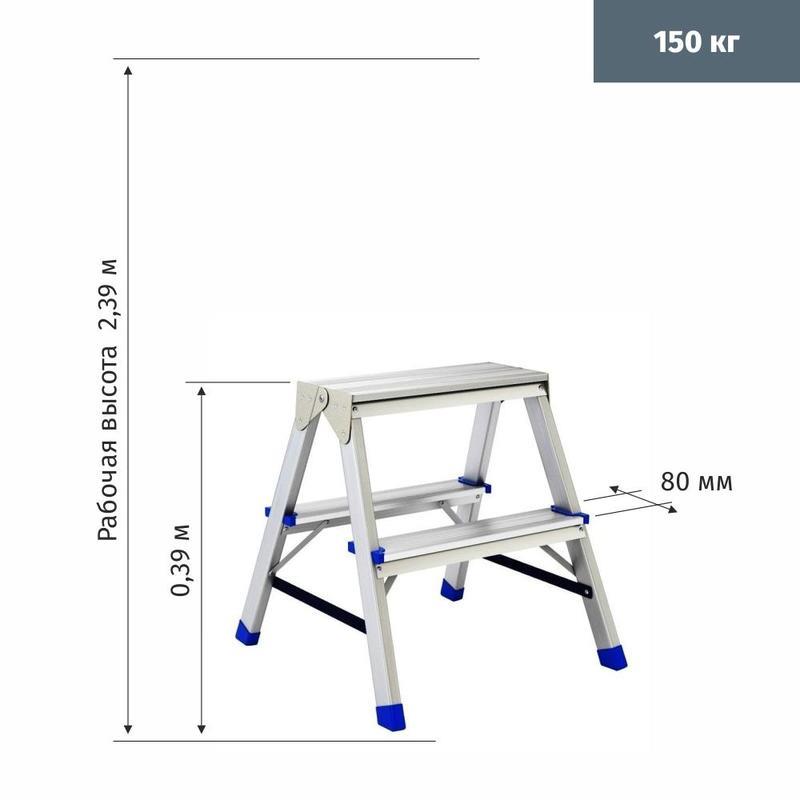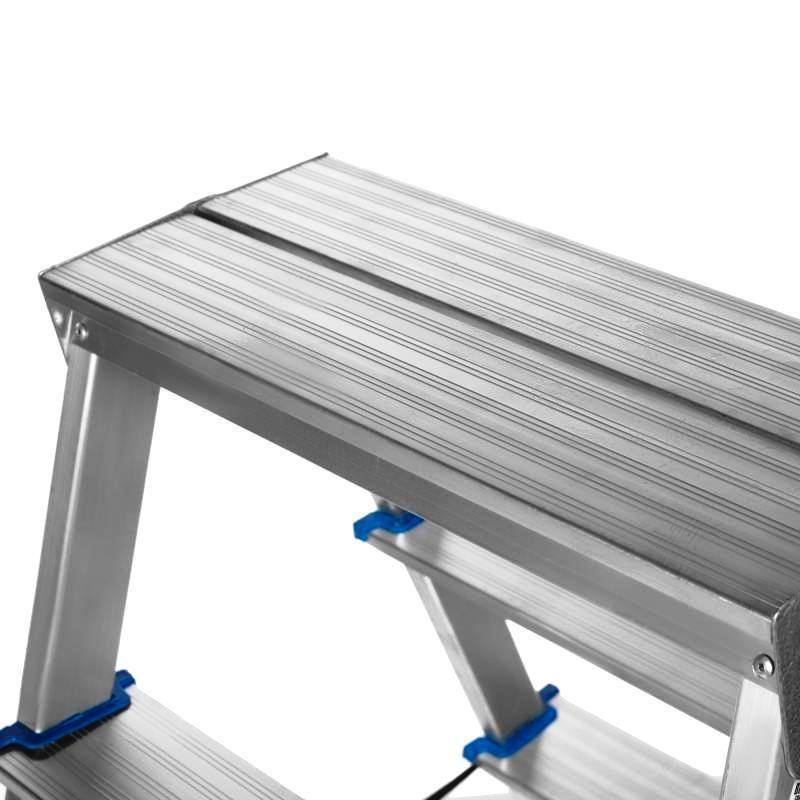 Легкие и прочные двусторонние стремянки выдерживают увеличенный вес до 15 кг, имеют рифленые ступени и удобную широкую площадку. Благодаря пластиковым заглушкам не скользят и не повреждают напольное покрытие. Идеальны для работы одного или двух человек одновременно. Имеет широкие рифленые ступени для безопасного подъёма и спуска. При изготовлении использовался прессованный алюминиевый профиль. Это гарантирует изделию коррозионную стойкость и прочность.