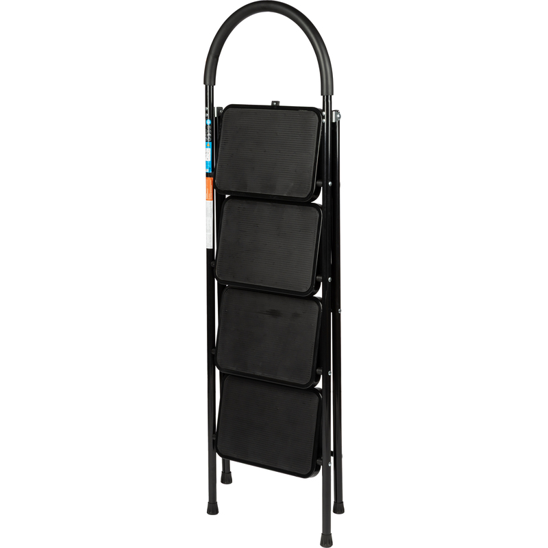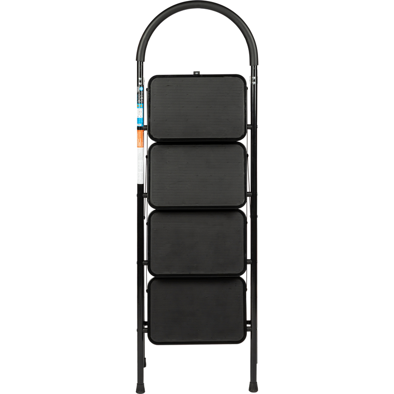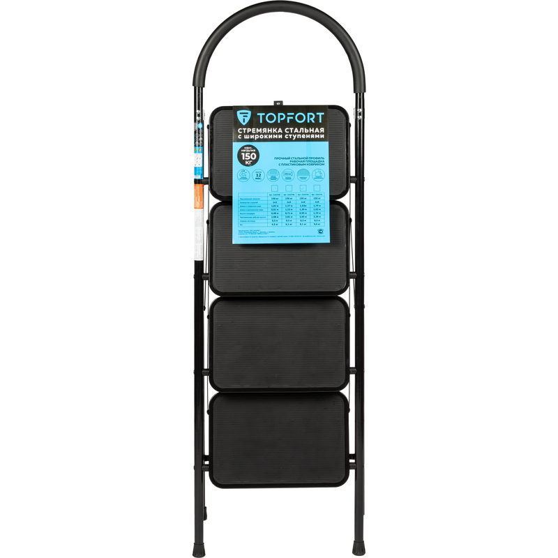 Стремянка стальная с широкими ступенями TOPFORT. 4 ступени. Предназначена для проведения различных видов работ на высоте, как в быту, так и на производстве. Представляет собой свободностоящую переносную лестницу, имеющую сторону подъема (передняя нога), опорную сторону (задняя нога) и рабочую площадку. Эргономичная дуга безопасности с кожухом из вспененной резины является дополнительным элементом защиты при работе на высоте. Тетива передней ноги, задняя нога и ступени выполнены из стального профиля, защищенного от коррозии порошковой краской. Рабочая площадка выполнена из оцинкованной стали. Вставки ступеней и башмаки изготовлены из высокопрочного пластика с рифлением, что предотвращает скольжение во время эксплуатации. Стремянка в рабочем положении должна быть полностью раскрыта, верхняя ступень плотно лежать на трубке задней ноги.