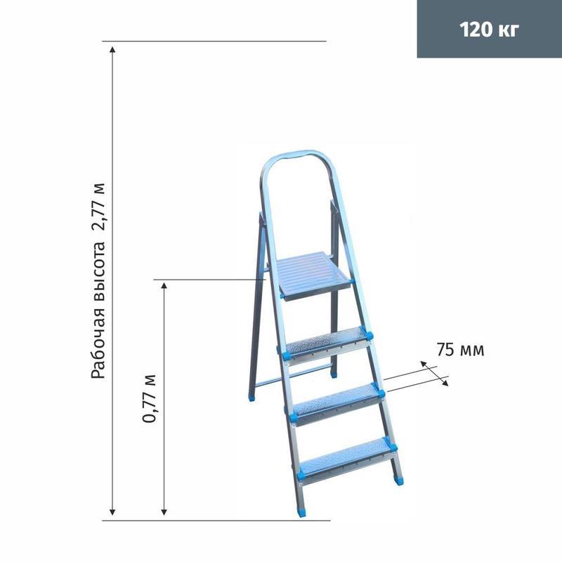 Стальная 4-ступенчатая оцинкованная стремянка Zalger. Для бытовых, ремонтных и отделочных работ. Стальная платформа 25 см и ступени 7,5 см с рифленой противоскользящей поверхностью. Усиленное 4-точечное крепление ступеней к профилю стремянки. Пластиковые насадки на ножках обеспечивают стабильность и безопасность. Рабочая высота: 252 см. Максимальная нагрузка — 120 кг.