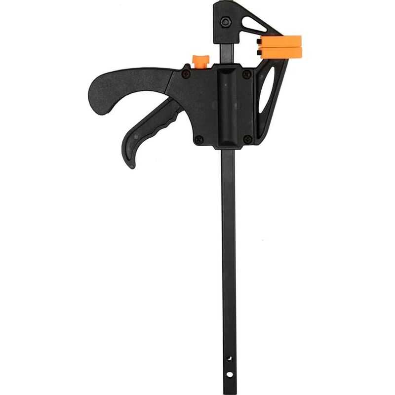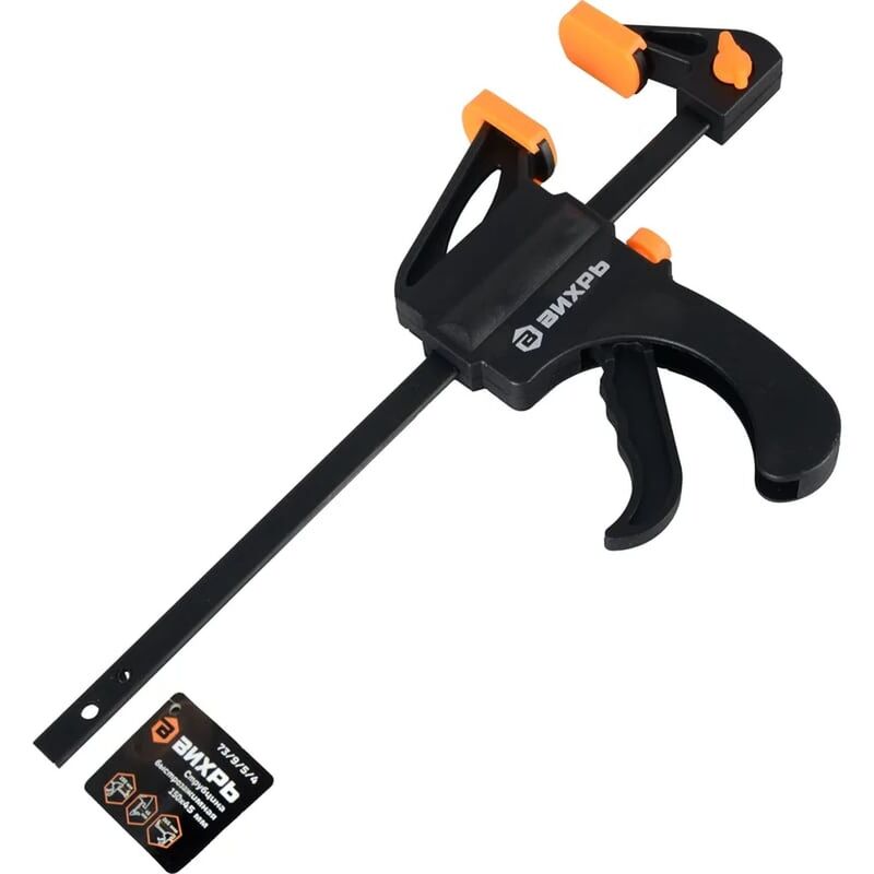 Струбцина быстрозажимная 150×45 мм Вихрь представляет собой инструмент пистолетной формы и предусматривает наличие рычажного быстрозажимного механизма. Это делает эксплуатацию струбцины легче, позволяя работать с ней одной рукой. Конструкция инструмента позволяет использовать его также в режиме распора.