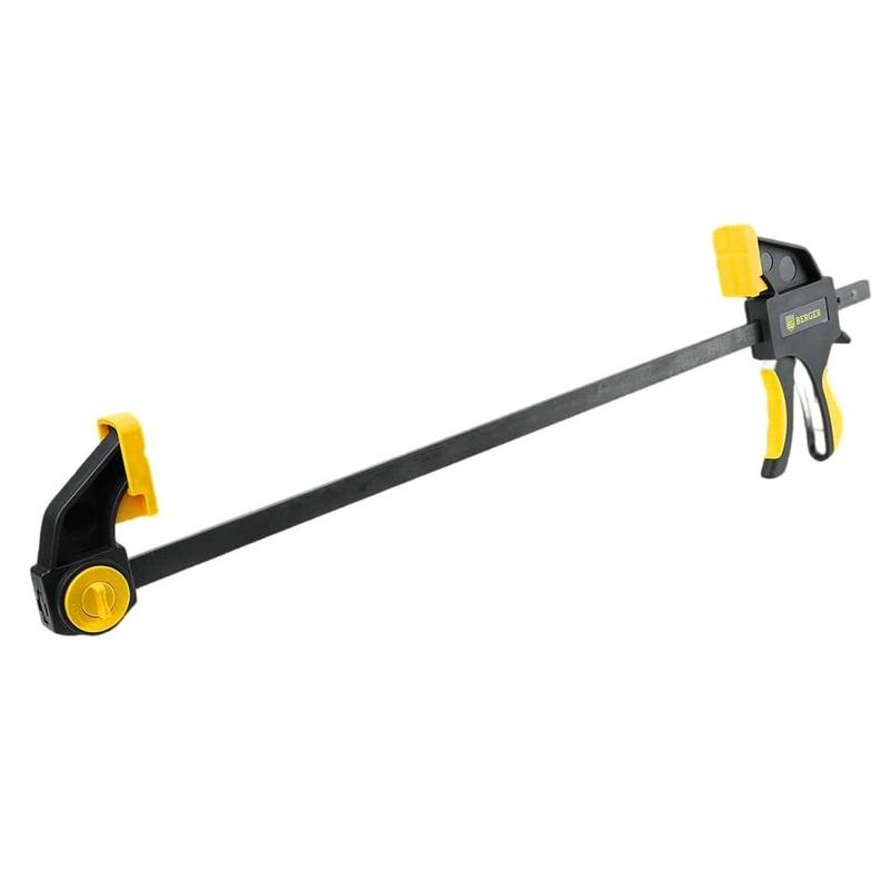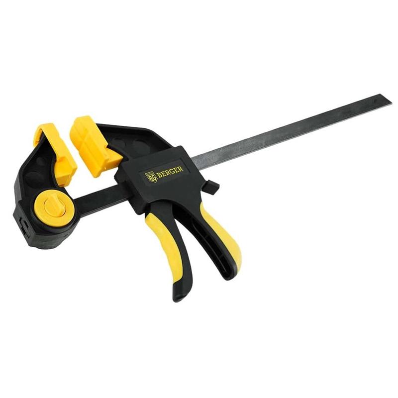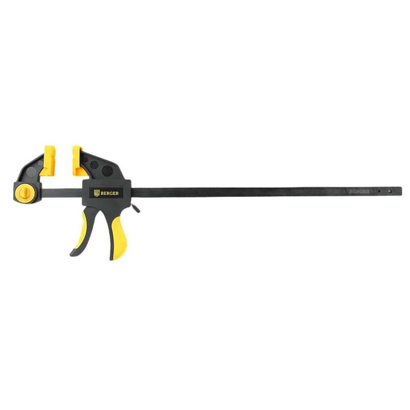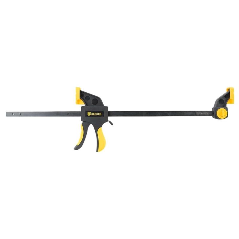Струбцина реечная быстрозажимная 300 мм Berger.Характеристики:— Глубина зажима: 70 мм;— Ширина захвата: 300 мм;— Длина при распоре: 157–493 мм;— Габариты губок: 31×52 мм;— Усилие сжатия: до 60 кг.Особенности:— Материал корпуса: высокопрочный полиамид с мягкими вставками из термопластичной резины (PA66 TPR);— Материал рукоятки: 2-х компонентная рукоятка с мягкими вставками;— Материал рамы: конструкционная сталь A3;— Материал губок: термопластичная резина (TPR). Внешний вид и/или характеристики товара могут быть изменены производителем в соответствии с производственным процессом.