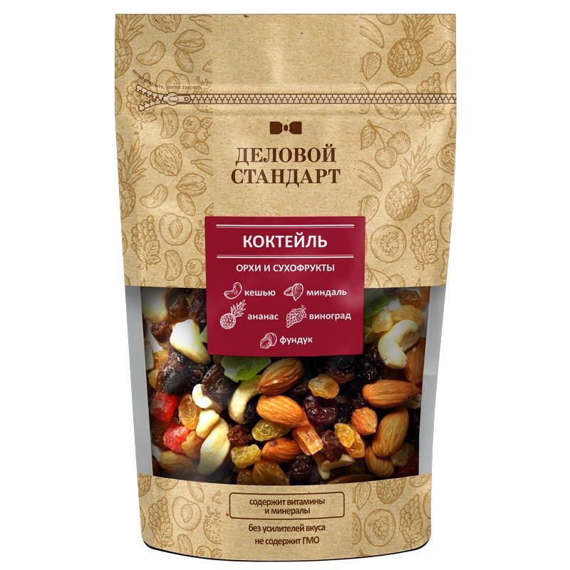 Коктейль орехи и сухофрукты Деловой Стандарт — это классическая среди коктейлей. Изюм, например, богат железом и калием, магнием и фосфором, которые являются отличными помощниками для системы кровообращения. Коктейль можно использовать в кулинарии: добавлять в выпечку, десерты, напитки или подавать как самостоятельную закуску с медом, молоком и др.