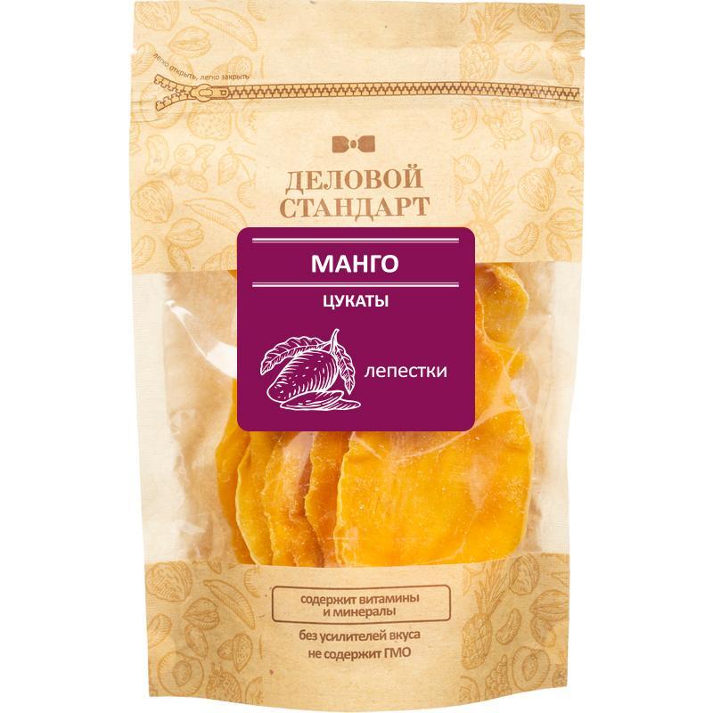 Цукаты манго 'Деловой Стандарт' — это кусочки спелого сочного манго, сваренные в сахарном сиропе и высушенные методом щадящей сушки. В манго много витаминов и минералов, полезных для человеческого организма. Вкус насыщенный, сладкий! — Состав: манго, сахар, регулятор кислотности лимонная кислота. — Пищевая ценность: белки — 0 г, жиры — 0 г, углеводы — 87 г. — Энергетическая ценность: 350 ккал/1470 кДж. — Срок годности: 12 месяцев. — Условия хранения: при температуре от 5°С до 25°С и относительной влажности воздуха не более 70%. — Вес: 200 г. — Страна производства: Россия. Возможно присутствие в незначительном количестве частиц других орехов, арахиса, кунжута, глютена и продуктов переработки молока.