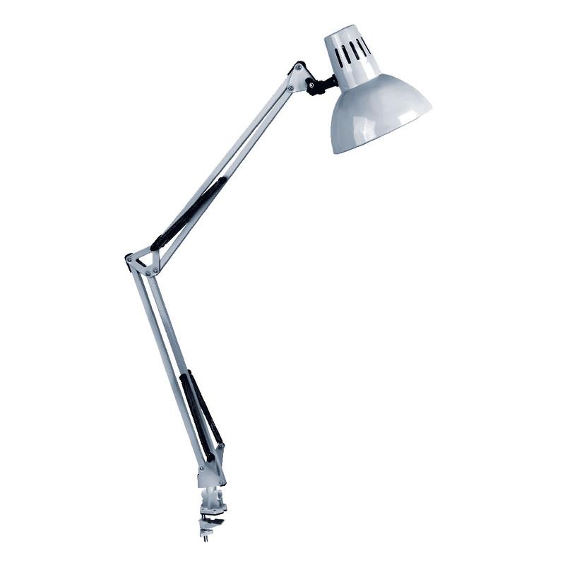 Современный универсальный настольный светильник, изготовленный из металла, предназначен для освещения рабочего места в офисе и дома. Двузвенная металлическая стойка позволяет регулировать наклон светильника и высоту плафона в широком диапазоне. Струбцина позволяет крепить светильник как к горизонтальной так и к вертикальной поверхности. Выключатель находится на проводе 1,6 м. В качестве источника света можно использовать лампу мощностью до 60 Вт с цоколем E27.