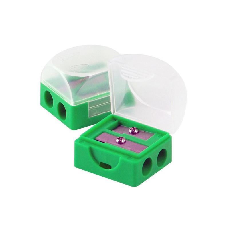 Точилка Attache в пластиковом корпусе, с двумя отверстиями для заточки цветных и чернографитных карандашей диаметром 8 мм. Снабжена металлическими лезвиями. Открывающая крышка служит контейнером для стружки. Цвет корпуса зеленый. Поставляется в упаковке по 2 шт.
