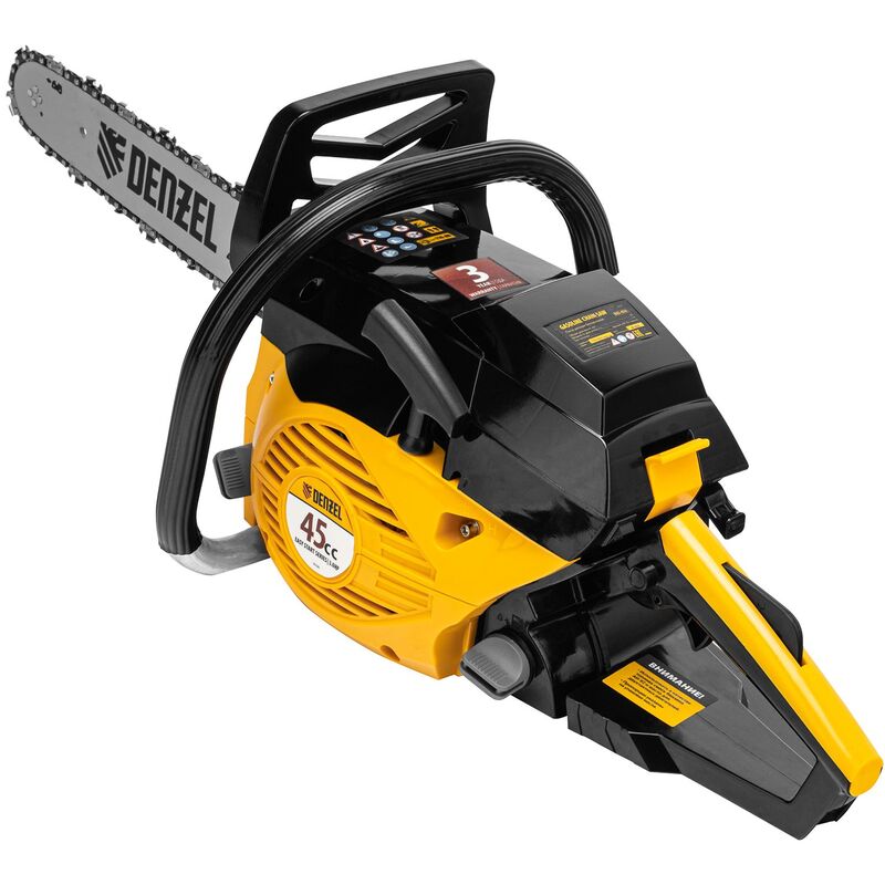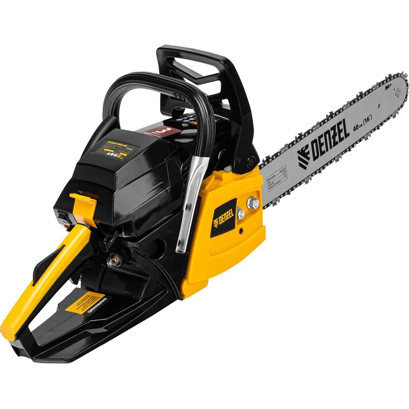 Пила цепная бензиновая Denzel DGS-4516 (95230) с двигателем объемом 45 см³ и мощностью 3.0 л.с. поставляется с шиной длиной 40 см и цепью с 57 звеньями (шаг 3/8″, паз 1.3 мм). Это бытовой инструмент для заготовки дров, обрезки ветвей и сучьев в саду, распила древесины твердых и мягких пород. Пила выдерживает интенсивные нагрузки, используется во время строительных и ремонтных работ, будет полезна на дачном участке.