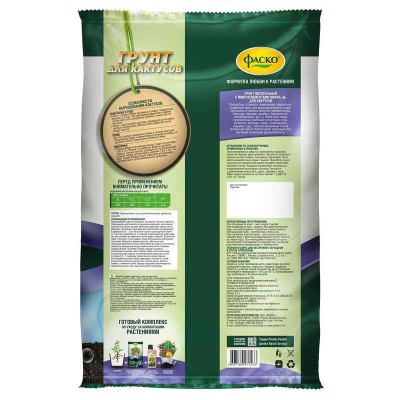 Специализированный почвогрунт для выращивания кактусов, а также суккулентов. Обеспечивает стабильный рост и развитие растений, предупреждает растрескивание. Используется как для выращивания, так и при пересадки. Возможно использование в зимнем саду. Состав: торф верховой, дренаж керамзитовый, песок, доломитовая мука, комплексное минеральное удобрение с микроэлементами. Упаковка: пакет. Страна производства: Россия. Объем: 2.5 литра. Вес: 1.15 кг.
