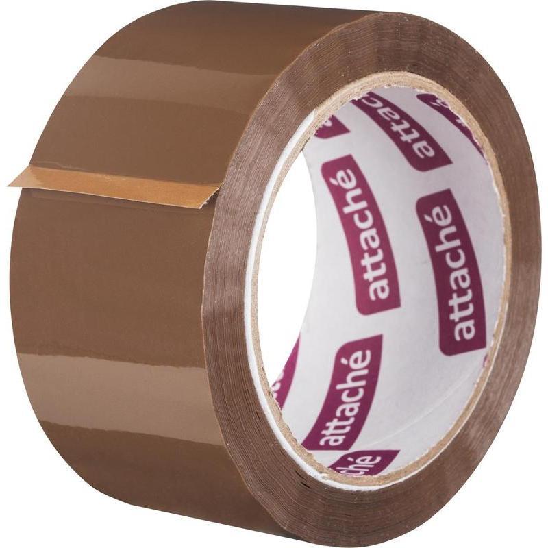 Клейкая лента упаковочная Attache толщиной 50 мкм, коричневая. Отличается высокой адгезией клея (слипанием с поверхностью), стойкостью к разрыву. Морозостойкая. Ширина ленты — 50 мм, длина намотки — 66 м. Широкая клейкая лента предназначена для упаковки тяжёлых и объёмных грузов, не теряет свойств на открытом воздухе при температуре от 10 до 30 градусов Цельсия. Груз может храниться при температурах, близких к −10 градусов Цельсия, или при повышенной/пониженной влажности.