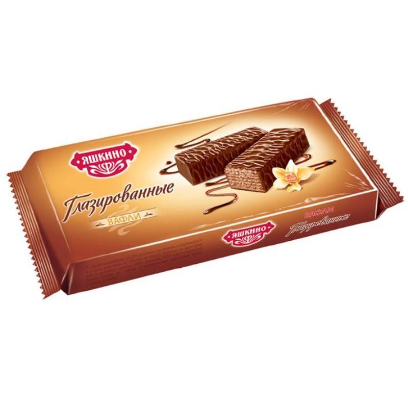 Вафли «Яшкино», глазированные шоколадом. Поставляются в контейнере, 200 г. Срок годности — 240 дней.