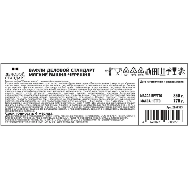 Вафли голландские Деловой Стандарт с начинкой вишня-черешня 770 г
