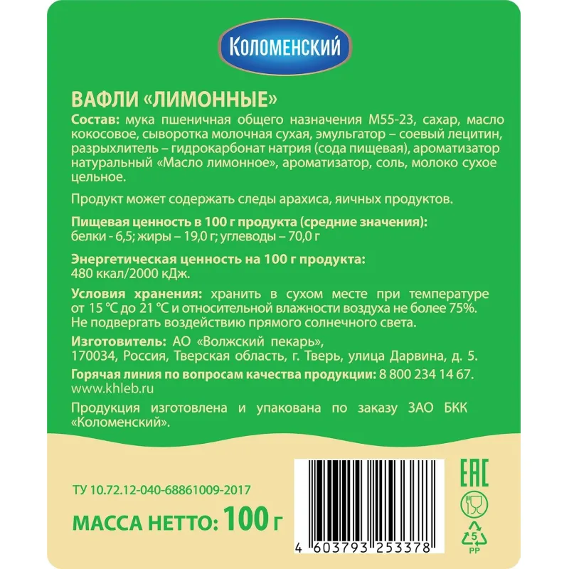 Состав: мука пшеничная общего назначения М55-23, сахар, масло кокосовое, сыворотка молочная сухая, эмульгатор — соевый лецитин, разрыхлитель — гидрокарбонат натрия (сода пищевая), ароматизатор натуральный «Масло лимонное», ароматизатор, соль, молоко сухое цельное.